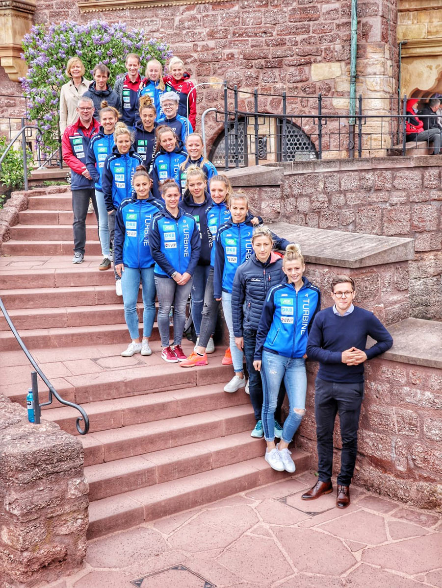 Dies war der Höhepunkt eines umfangreichen Programms, denn bereits am Donnerstag wurden die Spielerinnen und das Trainerteam zu einem gemeinsamen Abendessen in Thüringen eingeladen. Freitag früh ging es zu einer hochinteressanten Führung auf der Wartburg und am Nachmittag durfte sich die Mannschaft das Eisenacher Werk anschauen, in dem der Lifestyle-Opel ADAM produziert wird. Zudem gaben die Spielerinnen den interessierten Opel-Mitarbeitern fleißig Autogramme und durften Fragen zum Herstellungsprozess ihres neuen Wagen stellen.