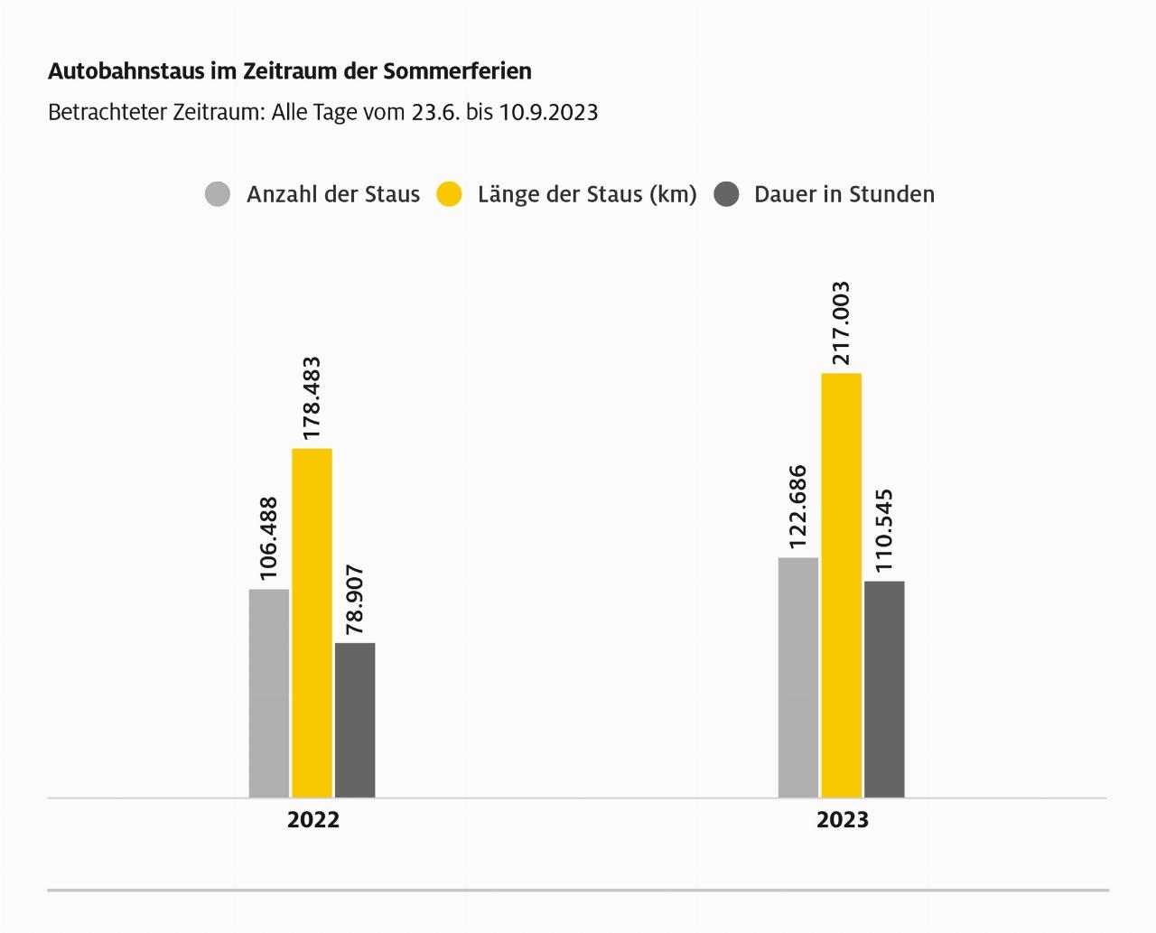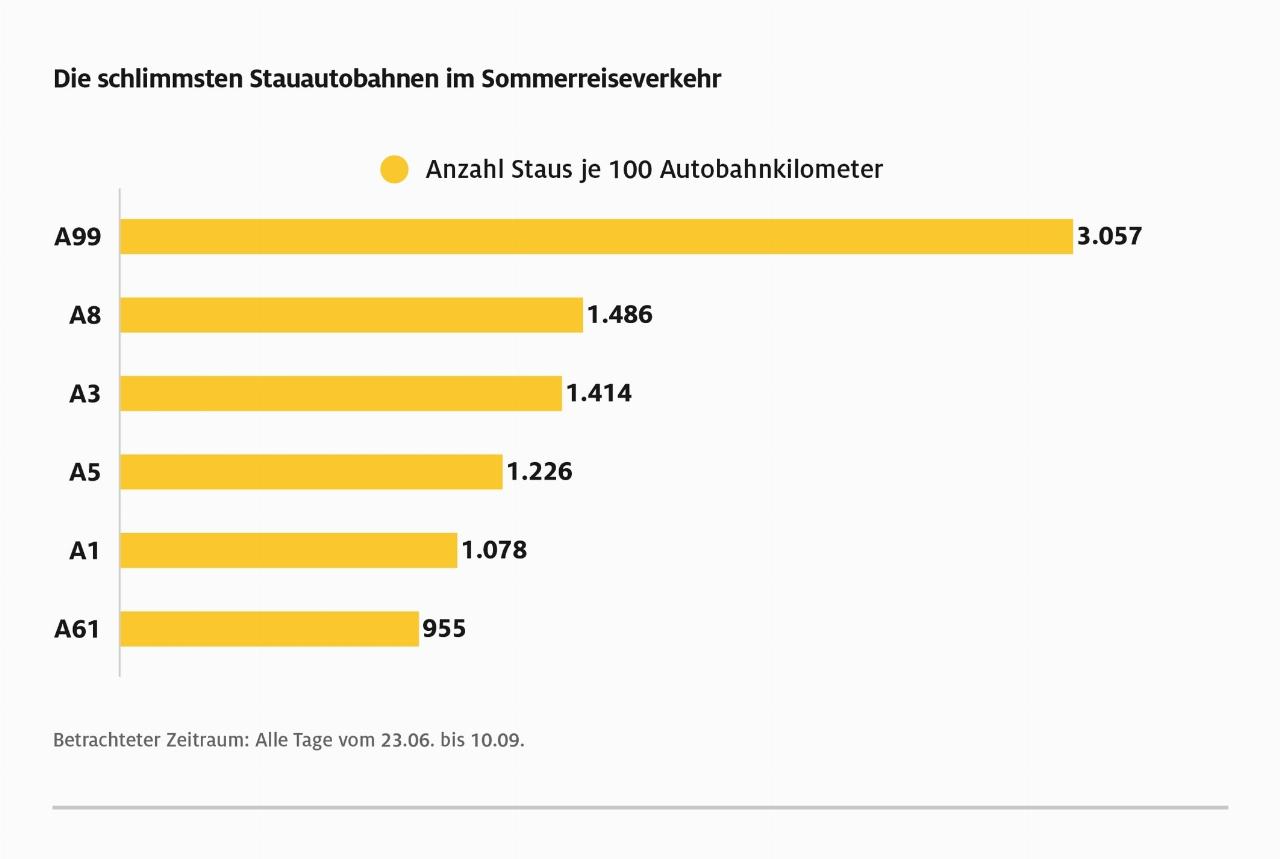 Da nach wie vor ein Großteil des Reise- und Freizeitverkehrs an den Wochenenden stattfindet, hat der Automobilclub diese gesondert ausgewertet. Das staureichste Wochenende war vom Freitag, 28. Juli, bis Sonntag, 30. Juli, als ausnahmslos alle Bundesländer in den Sommerferien waren. Der ADAC registrierte insgesamt 4176 Staus mit einer Gesamtlänge von fast 9000 Kilometern und einer Gesamtdauer von etwa einem halben Jahr. Der staureichste Tag über die ganze Ferienzeit war, wie schon in den Jahren zuvor, der Freitag mit etwa doppelt so vielen Staus wie am Samstag und Sonntag. Die Liste der schlimmsten Stauautobahnen führt – bezogen auf Streckenabschnitte von 100 Kilometern Länge – wie im Vorjahr die A 99, der Autobahnring München, an. Auf den Plätzen zwei und drei folgen die A 8 und die A 3.