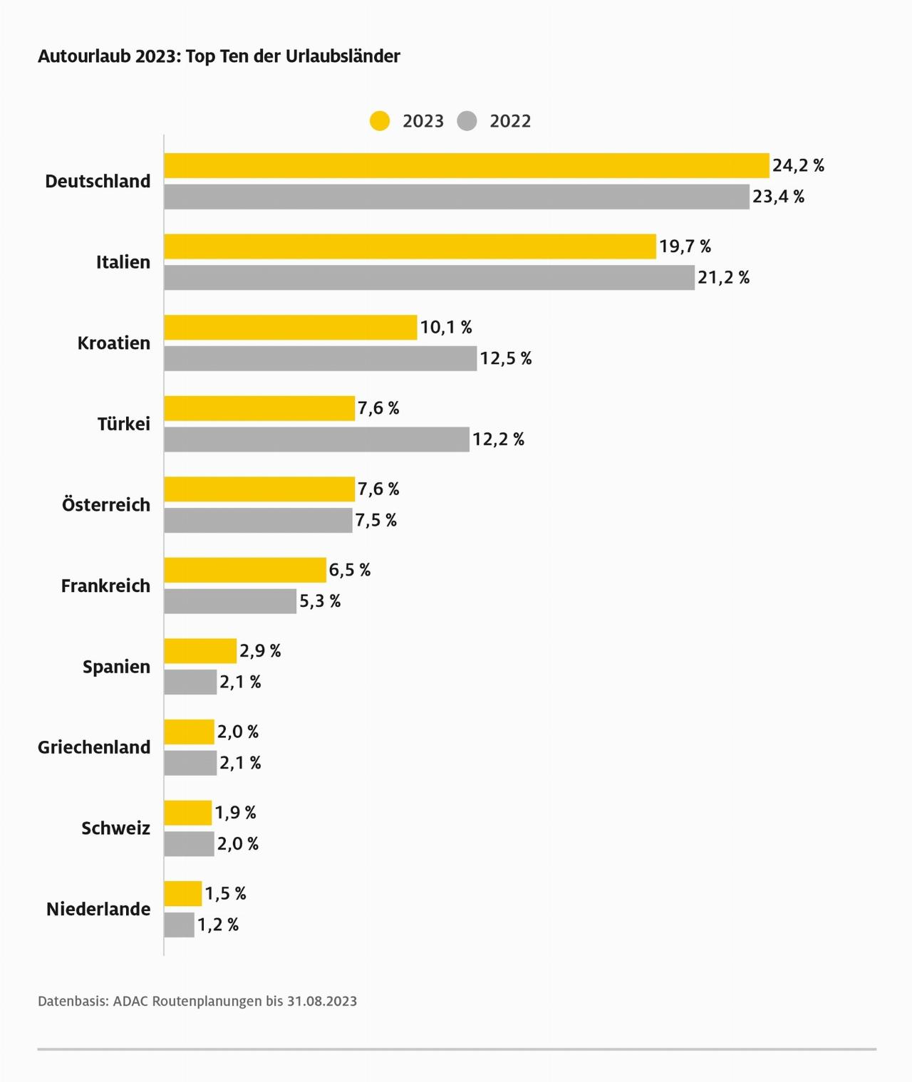 Zuwächse können auch die europäischen Destinationen auf den Plätzen zwei und drei verzeichnen. Zwar liegen die prozentualen Werte von Italien (2023: 19,72 % / 2022: 21,2 %) und Kroatien (2023: 10,21 % / 2022 12,5%) unter denen der Vorjahre, doch durch die insgesamt von 500.000 auf 800.000 gestiegenen Routenanfragen waren mehr Menschen im Urlaub in beiden Ländern. Österreich, Frankreich, Spanien und die Niederlande legten ebenfalls zu. Beim Campingurlaub zeigt sich nach der ADAC Auswertung auf den ersten Rängen ein ähnliches Bild. Deutschland liegt mit 22,9 Prozent vor Italien (17,3 %) und Kroatien (11 %). (aum)