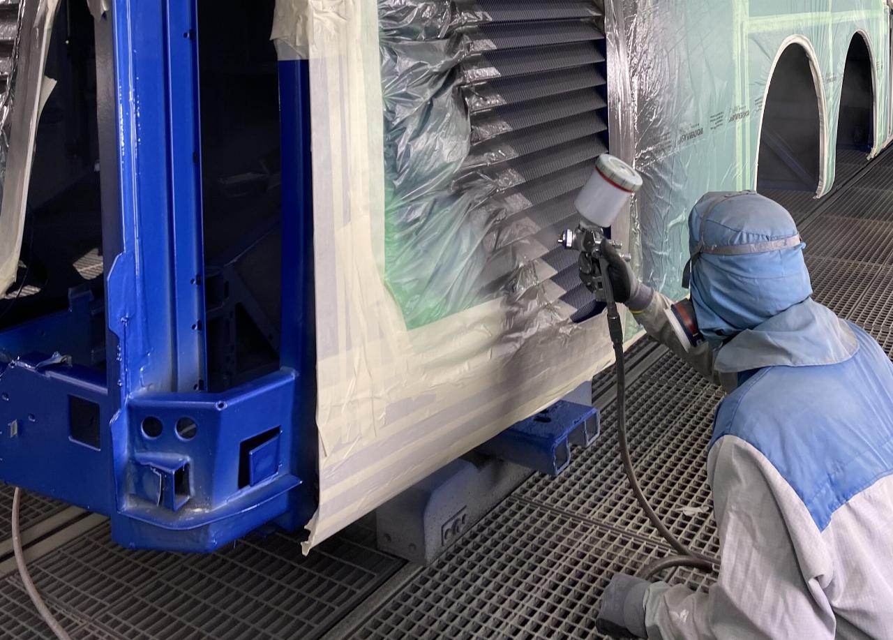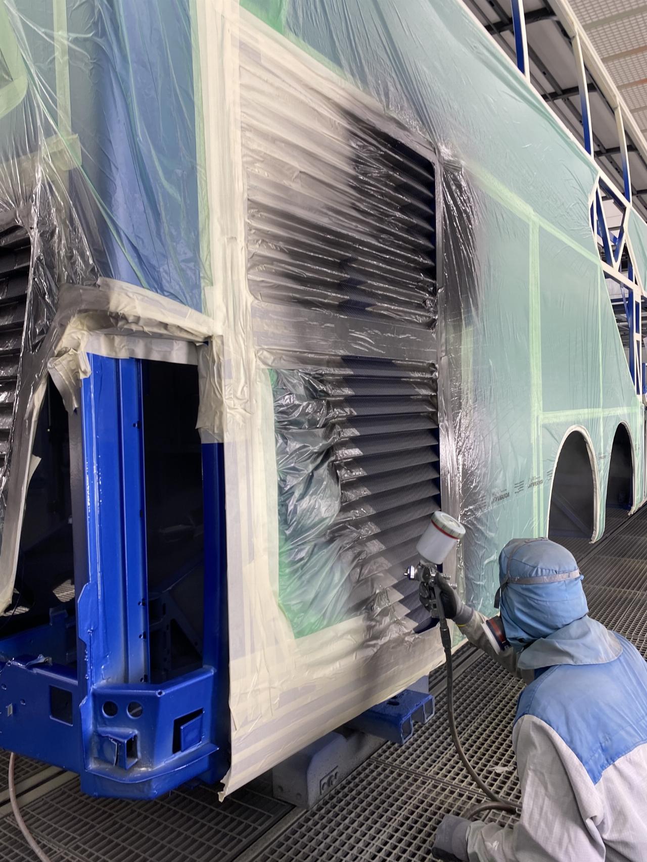 Die zu bearbeitenden Teile der Busse werden zunächst gewaschen und geschliffen, sodass eine Grundierung aufgebracht werden kann. Danach werden die Fahrzeugteile erneut leicht angeschliffen und mit der finalen Farbe, der sogenannten Decklackbeschichtung, versehen. Das Aufbringen der Grundierung und der einzelnen Farbschichten erfolgt vollautomatisch mit Roboter. Abschließend folgt die Innenraum- und Hohlraumbeschichtung sowie die Endmontage der verarbeiteten Karosserieteile am Gesamtfahrzeug. Das Farbsortiment umfasst rund 450 hauseigene Farbtöne, die um weitere Farbnuancen auf besonderen Kundenwunsch beliebig erweitert werden können. (aum)