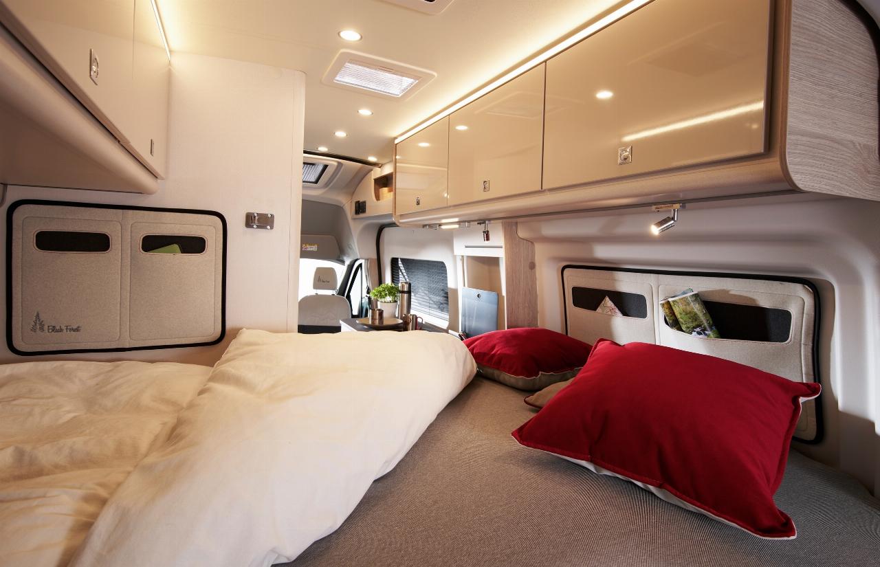 Zwei Grundrisse sind im Angebot, der Lineo C 590 und der Lineo C 550, beide rangieren in der Sechs-Meter-Klasse und haben großzügige Querbetten im Heck. Die Black Forst Edition setzt dabei auf ein eigenes Innenraumdesign mit speziellen Kissen und einem Spannbetttuch darauf. Dank des im unteren Küchenblock eingebauten Kühlschranks schafft die offene Blickachse ein gutes Raumgefühl, die Stehhöhe von fast zwei Meter erzeugt außerdem optische Weite.