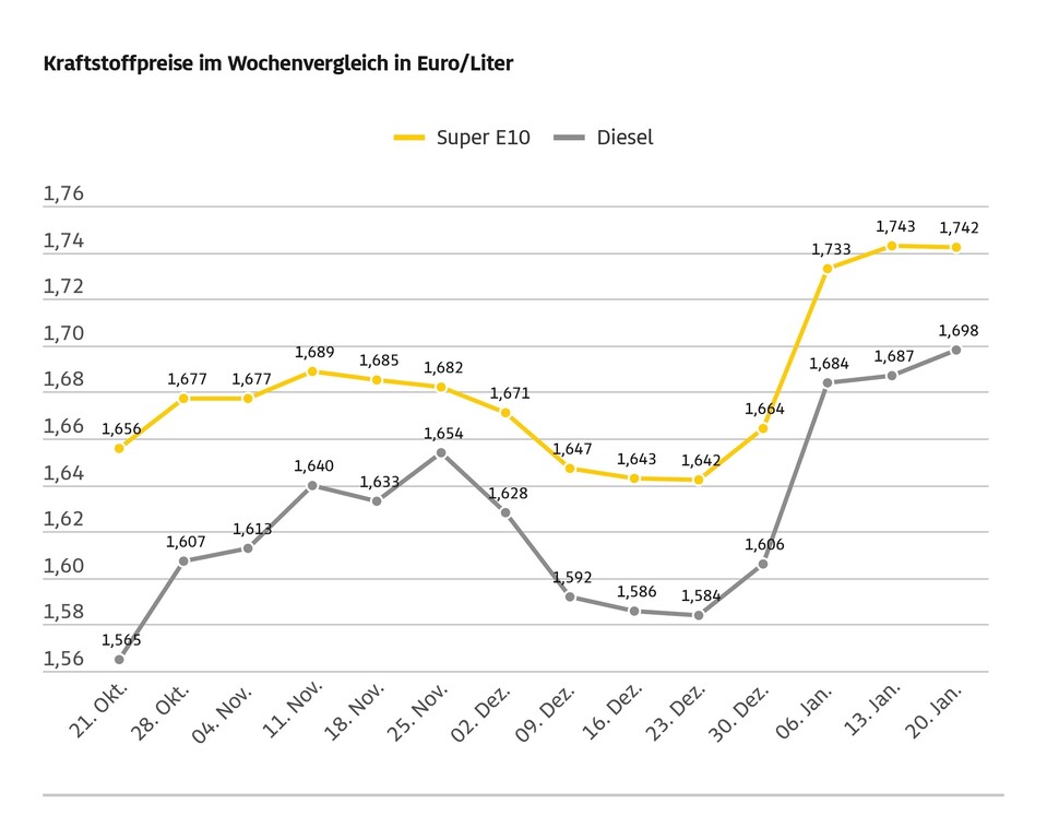Damals kostetet Rohöl der Sorte Brent jedoch fast 80 US-Dollar je Barrel und damit rund 15 Dollar mehr als derzeit. Zwar notierte der Euro im Vergleich zum US-Dollar schwächer, allerdings ergibt sich aus Sicht des ADAC in Summe deutliches Potenzial für geringere Dieselpreise. Super E10 liegt preislich aktuell in etwa auf dem Niveau des Vorjahres – auch hier stellt sich für den Club die Frage, ob es nicht angesichts des deutlich niedrigeren Rohölpreises spürbar billiger sein müsste. (aum)