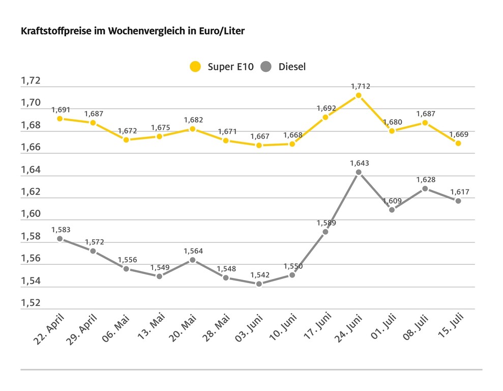 Nach Einschätzung des ADAC „hinkt der Rückgang des Dieselpreises den Erwartungen hinterher“. Mittlerweile beträgt die Preisdifferenz je Liter zwischen Super E10 und Diesel nur noch 5,2 Cent. Das ist ein für die Sommermonate ungewöhnlich niedriger Wert. Zudem ist die Mineralölsteuer auf den Liter Diesel rund 20 Cent niedriger als auf Benzin. Vor diesem Hintergrund werde deutlich, „wie sehr Diesel aktuell überteuert ist“.