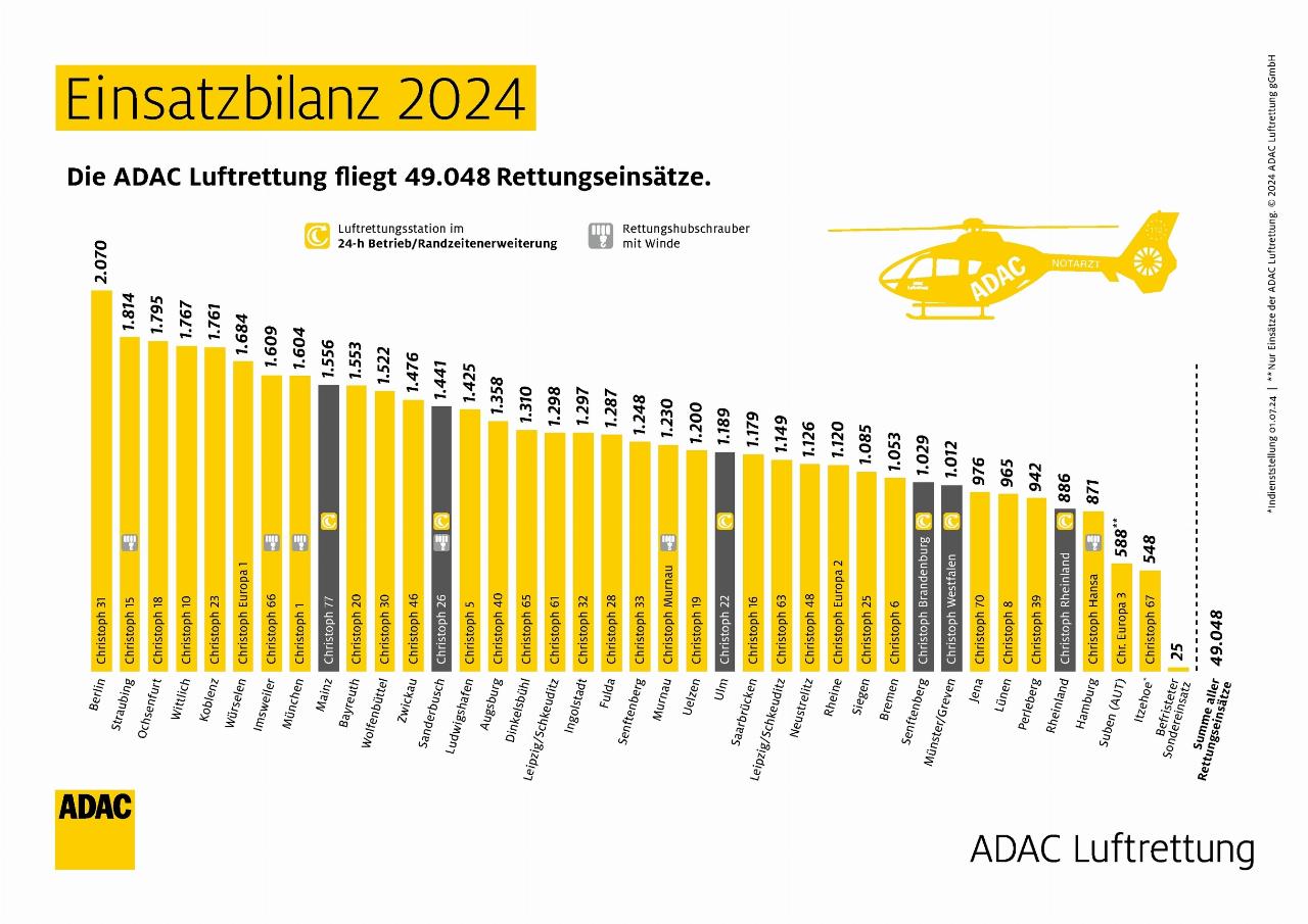 Die meisten Flüge absolvierten die gelben Engel der Lüfte 2024 in Bayern mit 12.015 (Vorjahr 12.998). Dort befinden sich auch die meisten Stationen. Dahinter folgen Rheinland-Pfalz mit 7907 (8761), Nordrhein-Westfalen mit 5603 (5796) und Niedersachsen mit 5394 (5705). Bei Städten mit den meisten Alarmierungen unter den 38 Stationen liegen die ADAC Rettungshubschrauber „Christoph 31“ in Berlin (2070), „Christoph 15“ in Straubing (1814) und „Christoph 18“ in Ochsenfurt (1795) auf den vorderen Plätzen. Der 2024 neu in Itzehoe in Schleswig-Holstein stationierte „Christoph 67“ flog im ersten Halbjahr bereits 548 Einsätze.