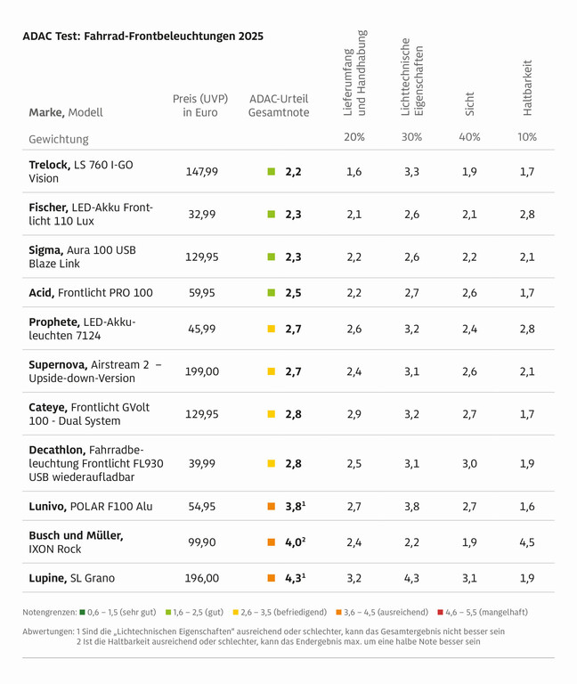 Bei den Frontscheinwerfern lag der Fokus des Tests auf Produkten mit etwa 100 Lux Beleuchtungsstärke und einer StVZO-Freigabe. Im Ergebnis schneiden vier Fahrradscheinwerfer gut ab – und zwar die Produkte von Trelock (Testsieger mit einem ADAC Urteil von 2,2), Fischer (2,3), Sigma (2,3) und Acid (2,5). Dass eine gute Leuchte nicht teuer sein muss, zeigt das Produkt von Fischer mit einem Anschaffungspreis von knapp 33 Euro. Vier weitere Frontleuchten erreichen befriedigende Ergebnisse.