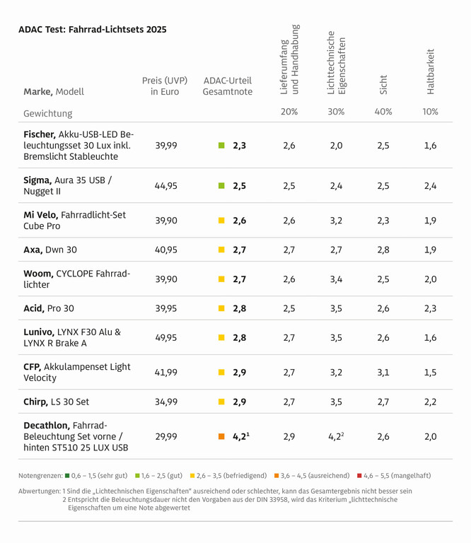 Von den Lichtsets mit Front- und Rückleuchte bis maximal 50 Euro erhielten zwei (Fischer und Sigma) das Urteil „gut“, sieben schnitten „befriedigend“ ab. Nur das Set von Decathlon (ADAC-Urteil 4,2) leistet sich Schwächen, da es die vorgeschriebene Mindestleuchtdauer nicht erreicht und das Rücklicht vergleichsweise schlecht wahrzunehmen ist.