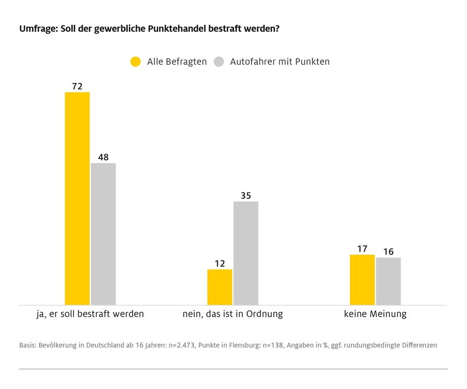 So finden auch 72 Prozent der Befragten, dass der gewerbliche Punktehandel bestraft werden sollte. Lediglich zwölf Prozent finden diese Praxis in Ordnung. Auffällig: Unter Autofahrern, die bereits Punkte in Flensburg haben, fordert nur fast die Hälfte (48 Prozent) eine konsequente Bestrafung dieser Praxis. 35 Prozent sehen hierfür keinen Grund. 50 Prozent derjenigen mit Punkten auf dem Konto halten es für wahrscheinlich, dass sie den Service der Punktehändler in Anspruch nehmen würden, um ein Fahrverbot zu umgehen, solange sie mit keinen rechtlichen Konsequenzen rechnen müssen.