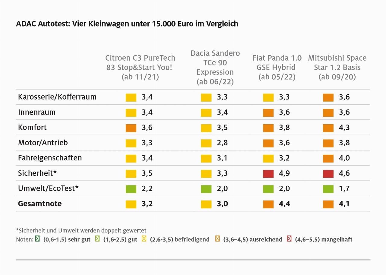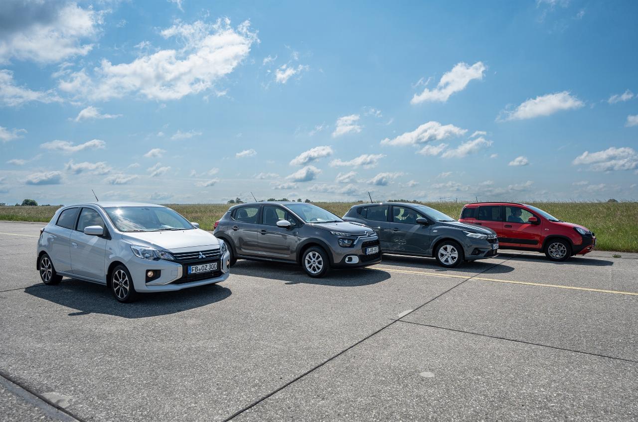 Der Dacia Sandero TCe90 Expression gewinnt den Vergleichstext mit der Note 3,0 und erhält eine klare Kaufempfehlung. Er basiert auf dem aktuellen Renault Clio und Captur, bietet am meisten Platz, den stärksten Motor und eine umfangreiche Komfort- und Sicherheitsausstattung zu einem günstigen Preis, so das ADAC-Urteil. Der Citroën C3 PureTech 83 You belegt den zweiten Platz (Note 3,2) mit harmonischen Fahreigenschaften und ausreichendem Platzangebot. Der laut Automobilclub „veraltete“ Mitsubishi Space Star 1.2 wird Dritter (Note 4,1) aufgrund spärlicher Ausstattung – auf Klimaanlage, Radio und Zentralverriegelung wird verzichtet – und fehlender Sicherheitssysteme. Schlusslicht ist der Fiat Panda 1.0 GSE Hybrid (Note 4,4) „aufgrund von Sicherheitsmängeln und unzeitgemäßer Sicherheitsausstattung“. So hat Fiat nach Angaben des ADAC mit dem Modelljahr 2023 den City-Notbremsassistenten und die Seitenairbags vorne gestrichen.