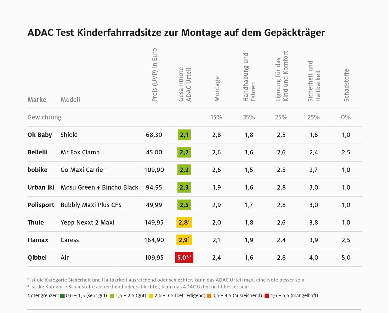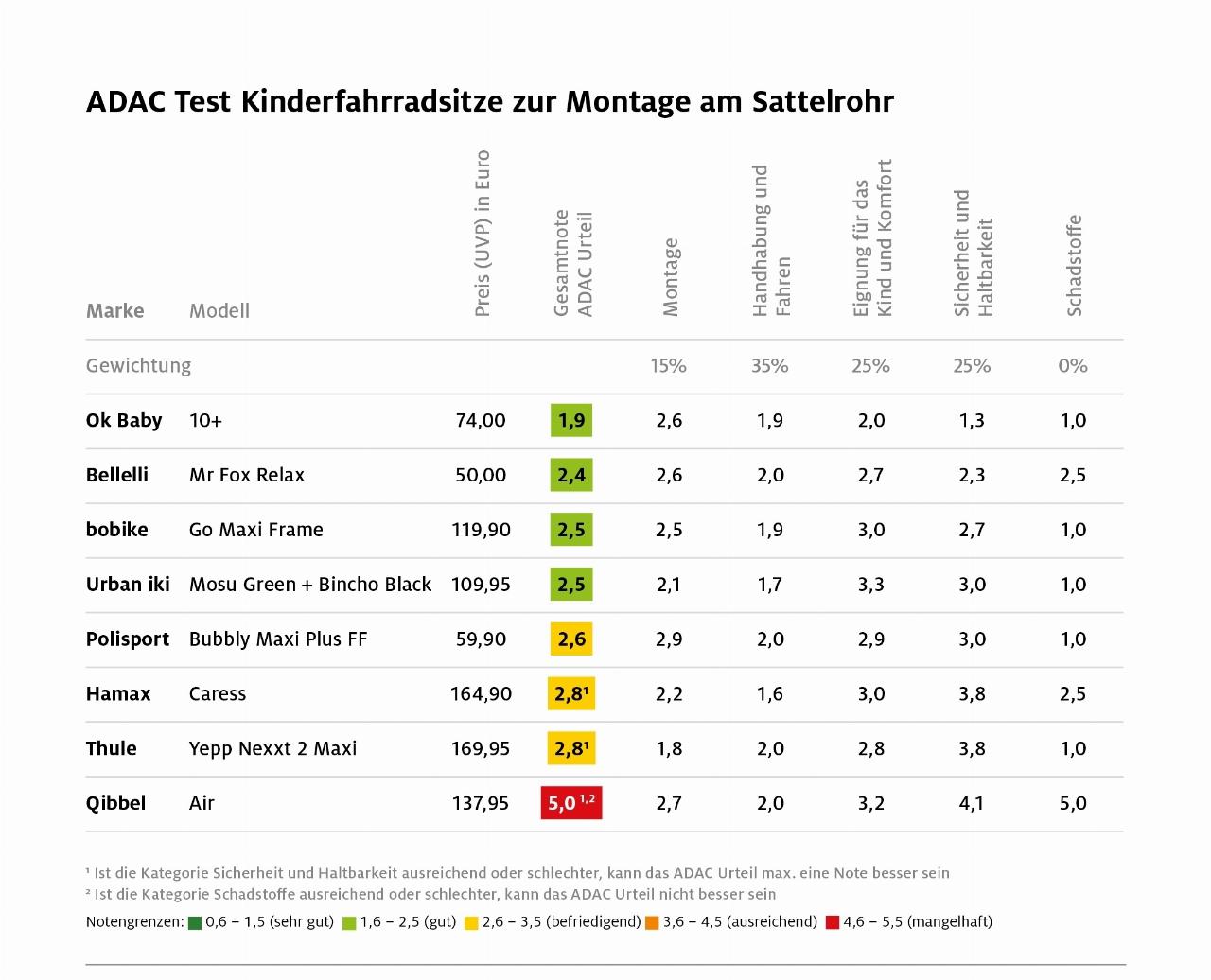 Die Tester nahmen jeweils ein Modell zur Sattelrohrmontage und eines zur Befestigung auf dem Gepäckträger desselben Herstellers unter die Lupe. Dabei zeigte sich: Die Montage am Gepäckträger ist meist stabiler und fürs Kind komfortabler als die am Sattelrohr. Doch keinbe regel ohne Ausnahme. Die beiden Modelle von OK Baby ließen sich gleichermaßen gut an Sattelrohr und Gepäckträger befestigen und sind bequem. Sie sind auch gelich die Testsieger, weil sie außerdem über gute Sicherheitseigenschaften im Kopfbereich verfügen, eine Liegefunktion (Modell für die Sattelstange) bieten und sogar abschließbar sind. Mit rund 70 Euro sind sie zudem relativ günstig, nur noch unterboten von dem jeweils zweitplatzierten Modell von Bellelli (45 bzw. 50 Euro).