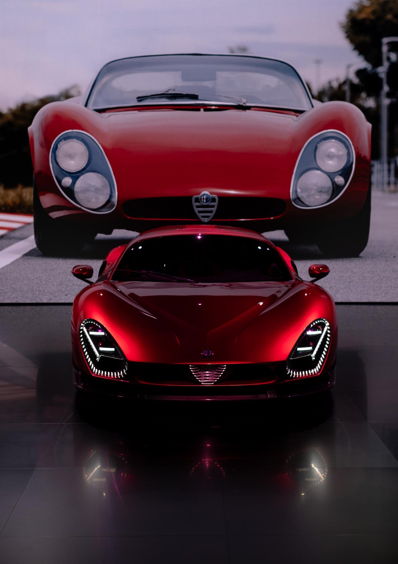 Auch für den aktuellen Nachfolger ist „Blu Reale“ eine von drei werksseitigen Optionen neben den Rottönen Rosso Alfa und Rosso Villa d'Este. Für den in Kleinstserie gefertigten Supersportwagen stehen zwei unterschiedliche Antriebsvarianten zur Wahl. In der Verbrennerversion kommt ein V6-Biturbo-Motor mit 620 PS (456 kW) zum Einsatz, der die Hinterräder antreibt. Mit dem neu entwickelten reinelektrischem Antrieb beträgt die Systemleistung 552 kW (750 PS), die auf alle vier Räder übertragen wird. Auch hier taucht die symbolträchtige Zahl in den technischen Daten an prominenter Stelle auf: Die Höchstgeschwindigkeit des Coupés beträgt 333 km/h. (aum)
