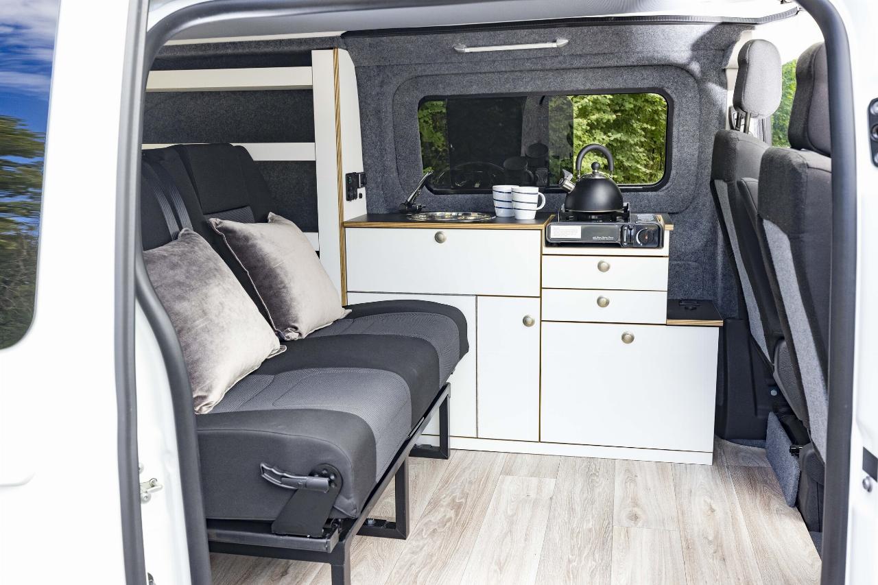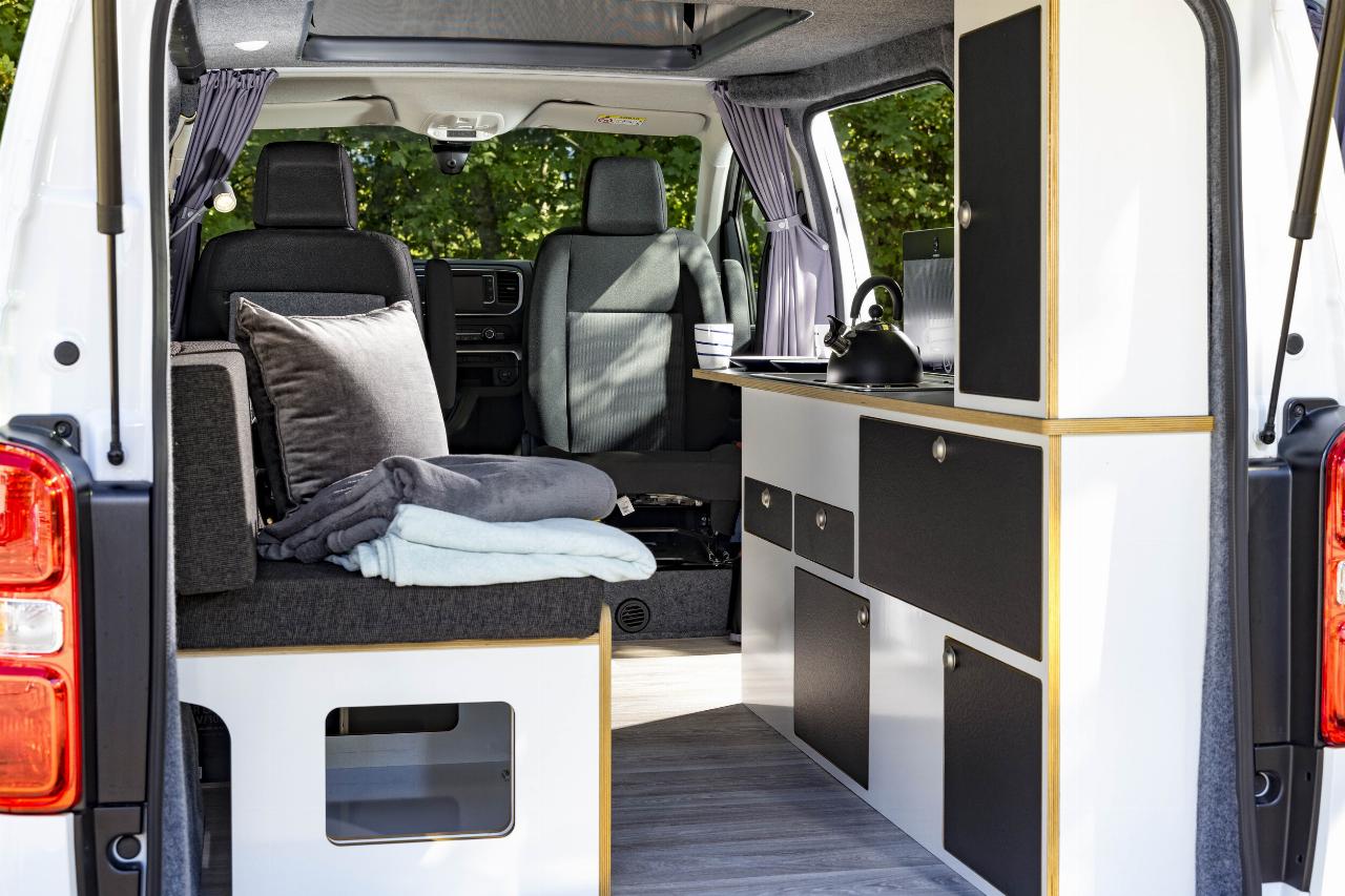 Im Alpincamper Vivaro 4 findet eine vierköpfige Familie Platz. Für die Alltagsfahrten in die Stadt hält der Freizeitvan neben Fahrer- und drehbarem Beifahrersitz zwei weitere Plätze im Fond inklusive Isofix-Vorrüstungen für die kleinen Passagiere bereit. Am Urlaubsort lässt sich die Schlafsitzbank in Sekunden zu einer 1,20 x 1,95 Meter großen Doppelliegefläche umbauen. Dazu kommt das Aufstelldach, unter dem sich entweder bequem stehen oder eine ebenfalls 1,20 x 1,95 Meter messende Liegefläche einrichten lässt. Darüber hinaus ist ein Küchenblock mit Spüle, Frisch- und Abwassertank sowie Kühlbox an Bord. Der einflammige, herausnehmbare Herd lässt sich über eine Gaskartusche versorgen.