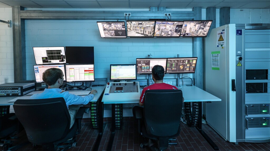 Hierfür wurde ein völlig neuer Verbundprüfstand entwickelt. Auf diesem lassen sich Antrieb, Batterie, Energiemanagement sowie Ladesystem gemeinsam und unter realitätsnahen Bedingungen testen. Die vier leistungsstarken Synchronmotoren des Prüfstands können so programmiert werden, dass sie unterschiedliche Fahrbahnbedingungen, Beschleunigungswiderstände sowie Kräfte beim Rekuperieren und Bremsen präzise simulieren. „Die Maschinen sind so hoch entwickelt, dass wir sogar verschiedene Asphaltoberflächen oder Reifenschlupf darstellen können“, erläutert Ingenieur Marcus Junige. Auch die Umgebungsbedingungen können vollständig nachgestellt werden. Die Simulation arbeitet inzwischen so präzise, dass es kaum noch Abweichungen gibt, die nach den realen Erprobungsergebnissen korrigiert werden müssen.