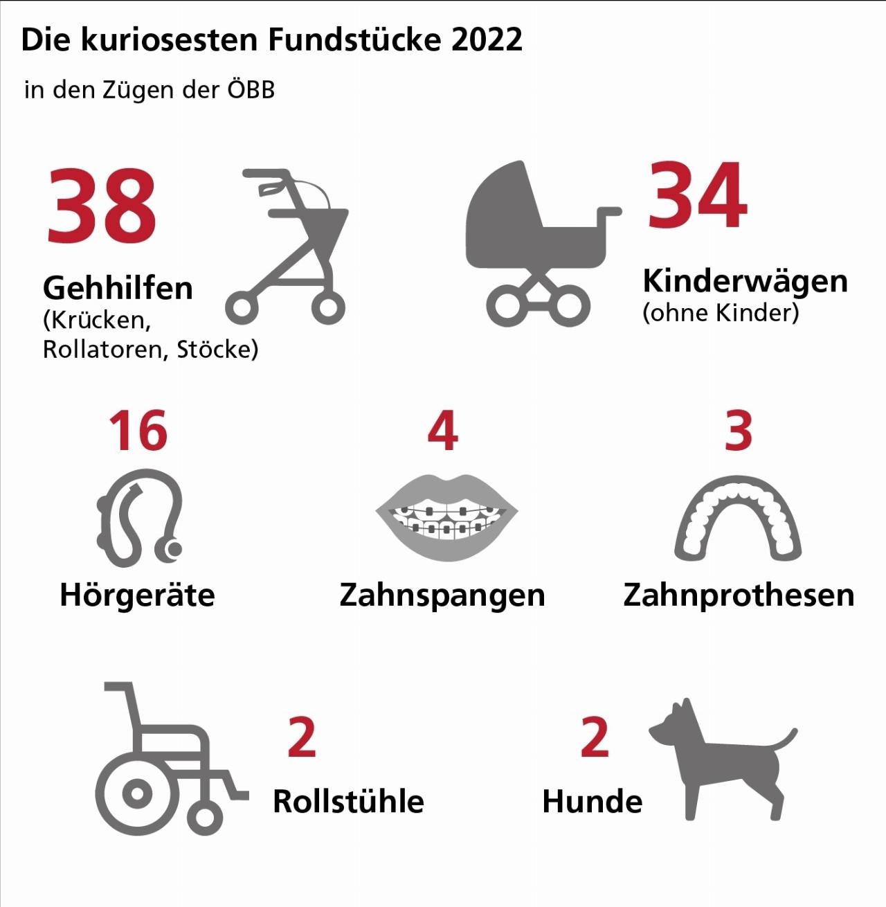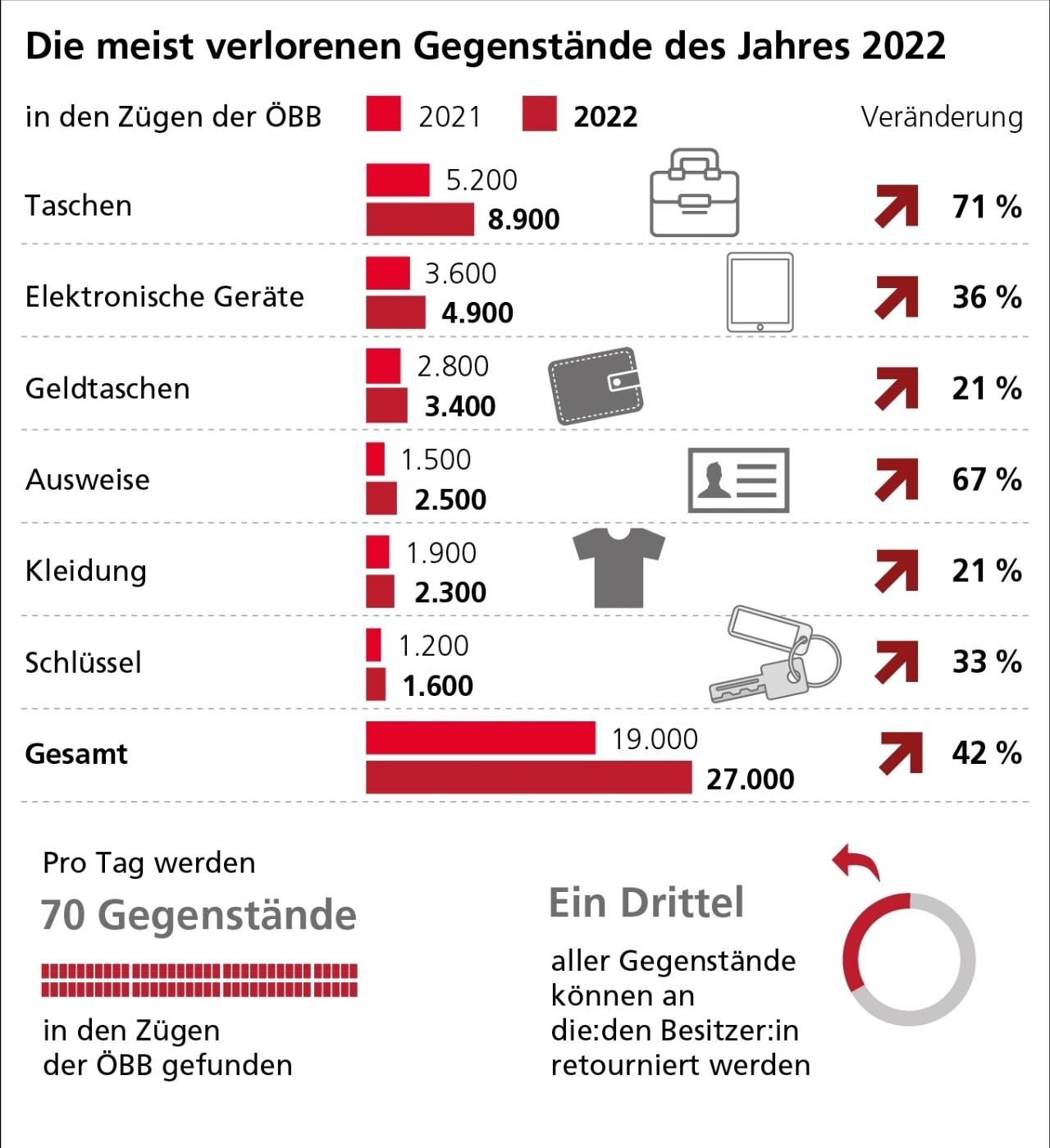 Nach wie vor stellen Gepäckstücke das Gros der Fundstücke. Rund 8900 Taschen, Koffer und Rücksäcke (2021: 5200 Stück) blieben in diesem Jahr in den Zügen oder auf dem Bahnsteig liegen. Platz 2 belegen auch dieses Jahr wieder Handys, Kameras und andere elektronische Geräte, die über 4900 Mal (Vorjahr: 3600) verlorengegangen sind. Außerdem wurden 3400 (2800) Brieftaschen, Geldfunde und Wertpapiere an einem der Lost-&-Found-Standorte der Österreichischen Bundesbahnen abgegeben.