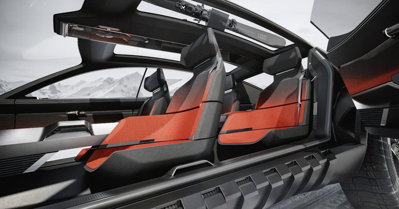 Während das Exterieur in einem metallischen grünblau-Ton namens arctic teal lackiert ist, präsentiert sich das Interieur in dunklem grau und lavarot, wobei strapazierfähige Stoffe und rustikal wirkende Metallapplikationen dominieren. Der Innenraum verweist in vielen Details auf Stil und Formen des Art Déco. Und die kamerabasierten Rückspiegel, die Audi schon im Q8 e-tron eingeführt hat, die aber im e-tron GT fehlen, feiern in dieser Studie fröhliche Urständ.