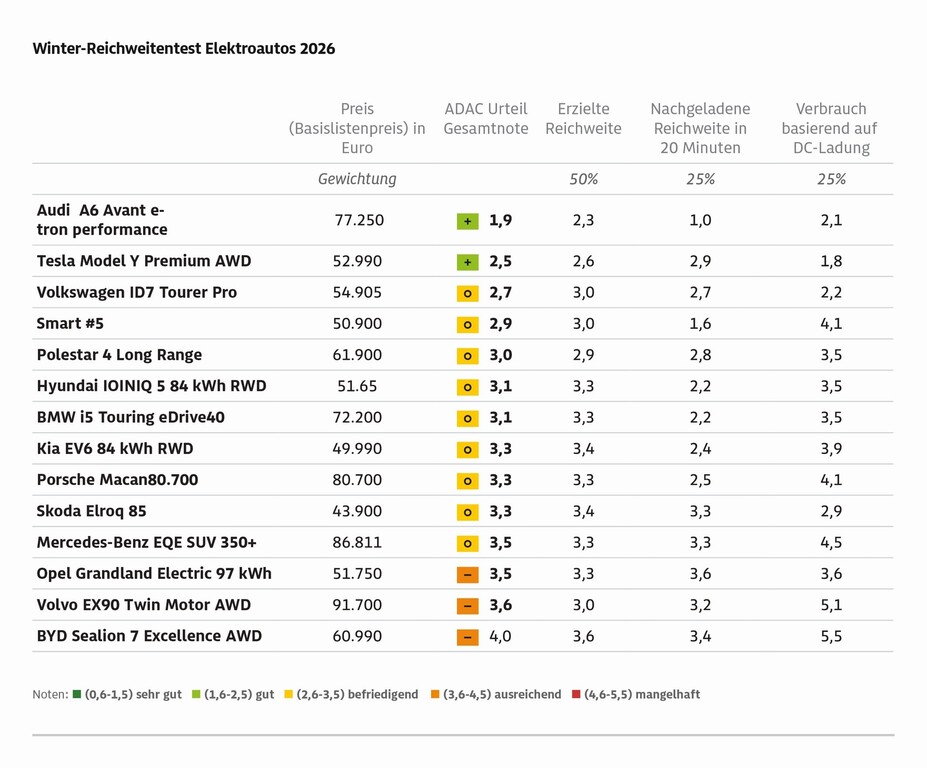 Im Gegensatz zum vergangenen Reichweitentest sind im diesjährigen Vergleich die teuersten Fahrzeuge nicht unbedingt die reichweitenstärksten. Der Audi liegt zwar mit 77.250 Euro im oberen Preisbereich, die darauffolgenden drei Modelle von Tesla, Volkswagen und Smart kosten zwischen 50.900 Euro und 54.905 Euro und können somit mit ihrer Preis-Leistung punkten. Der teuerste Testwagen, der Volvo EX 90 Twin Motor AWD, kostet 91.700 Euro und belegt nur den vorletzten Platz in der Gesamtwertung. Er fiel durch einen hohen Verbrauch von 31,6 kWh/100 km auf, auf, kam aber dank seiner 107-kWh-Batterie immerhin noch 360 Kilometer weit. Am schlechtesten schneidet der BYD Sealion 7 Excellence AWD ab. Trotz 91,3 kWh großer Batterie blieb er mit 293 Kilometern Reichweite als einziges Fahrzeug unter der 300-Kilometer-Marke. Der sehr hohe Verbrauch von über 35 kWh/100 km zeigt deutlichen Optimierungsbedarf bei winterlichen Bedingungen.