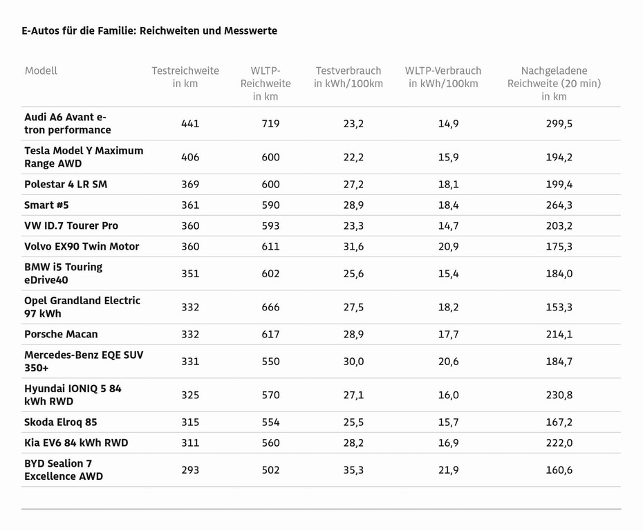 In die Endnote flossen die erzielte Reichweite (25 Prozent), die nachgeladene Reichweite in 20 Minuten (25 Prozent) und der Verbrauch (50 Prozent) ein. Klarer Sieger wurde der Audi A6 Avant e-Tron Performance. Im Test kam er nach 3 Stunden und 49 Minuten Fahrzeit 441 Kilometer weit und erreichte einen relativ niedrigen Verbrauch von 23,2 kWh auf 100 Kilometer. Für die komplette simulierte Strecke von München nach Berlin (582 km) wäre damit ein Ladestopp erforderlich gewesen. Durch das 800-Volt-System lud der Audi 300 Kilometer in 20 Minuten nach und erreichte damit Bestwerte in erzielter und nachgeladener Reichweite. Nur Teslas Model Y bot mit 22,2 kWh einen niedrigeren Energieverbrauch und belegte damit den zweiten Platz. Dicht dahinter folgten der Volkswagen ID 7 Tourer Pro und der Smart #5 Premium.
