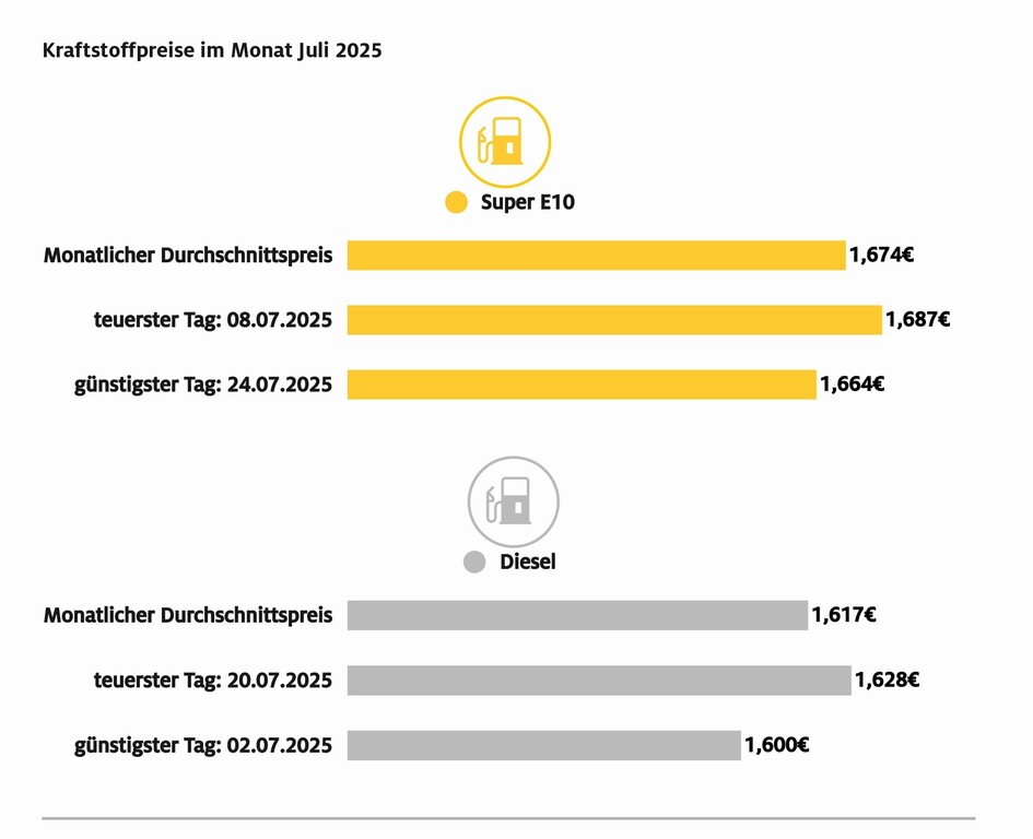 Teuerster Tag zum Dieseltanken war der 20. Juli, ein Liter kostete damals im Mittel 1,628 Euro. Der günstigste Tag war der 2. Juli mit einem Durchschnittspreis von 1,600 Euro. Bei Super E10 sah es genau andersherum aus. Der teuerste Tanktag lag eher am Monatsanfang, am 8. Juli kostet ein Liter im Durchschnitt 1,687 Euro. Zum Monatsende, nämlich am 24. Juli, lag der Preis pro Liter bei 1,664 Euro.