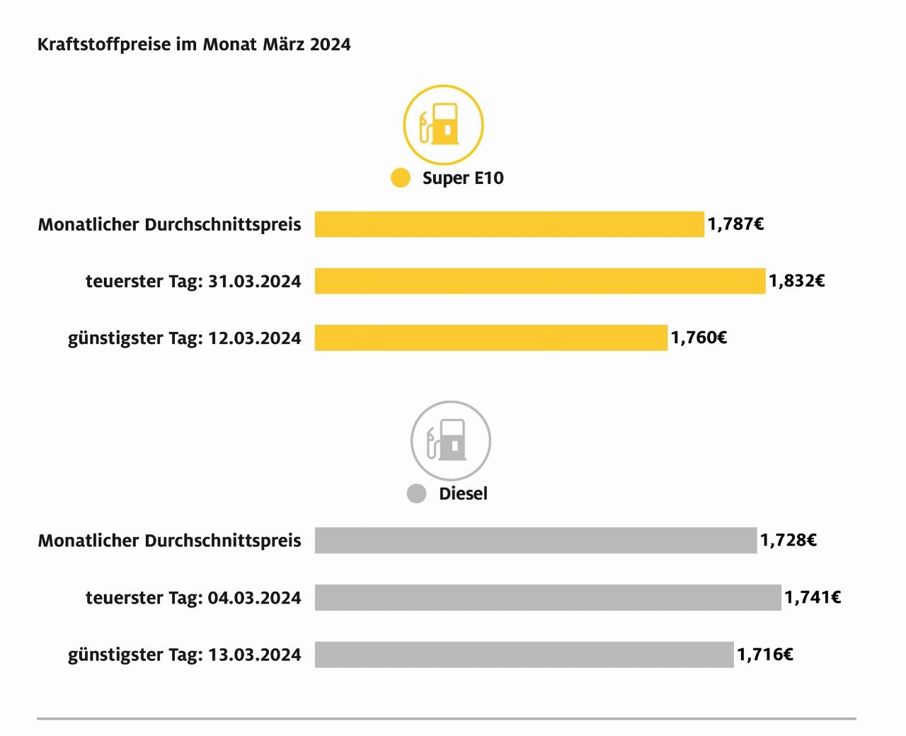 Am teuersten war Super E10 am 31. März 2024 mit 1,832 Euro. Der letzte Tag des Monats markierte gleichzeitig auch den bislang teuersten Tag des Jahres. Der günstigste Tag zum Tanken war für die Fahrer von Benzinern am 12. März mit 1,760 Euro je Liter Super E10. Bei Diesel war die Preisspanne innerhalb des Monats geringer: Am teuersten war Diesel am 4. März mit 1,741 Euro, am wenigsten musste mit 1,716 Euro am 13. März bezahlt werden. (aum)