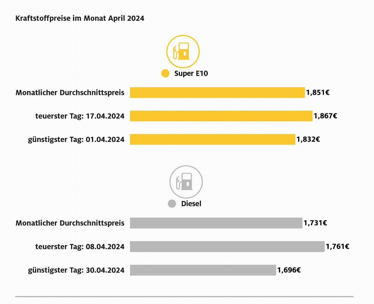 Teuerster Tag zum Tanken war für die Fahrer von Benzinern der 17. April mit im Bundesmittel 1,867 Euro je Liter Super E10. Am günstigsten war Super E10 am 1. April bei einem Durchschnittspreis von 1,832 Euro. Dieselfahrer tankten am 8. April mit 1,761 Euro am teuersten, am wenigsten bezahlen mussten sie am letzten Tag des Monats mit 1,696 Euro. (aum)