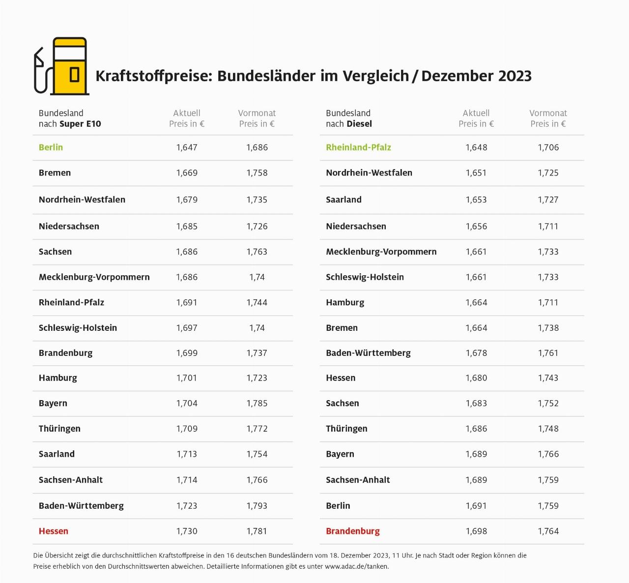 Rheinland-Pfalz ist – wie bei der Preisauswertung im November – auch heute das preiswerteste Bundesland für Diesel. Ein Liter des Selbstzünderkraftstoffs kostet momentan 1,648 Euro, gefolgt von Nordrhein-Westfalen mit 1,651 Euro. Teuerstes Bundesland ist Brandenburg. Dort müssen die Autofahrerinnen und Autofahrer für einen Liter Diesel aktuell 1,698 Euro bezahlen. In Berlin als zweitteuerstem Bundesland sind hierfür 1,691 Euro fällig. Die Differenz zwischen dem teuersten und dem günstigsten Bundesland beträgt bei Diesel fünf Cent und ist damit deutlich kleiner als bei Benzin.