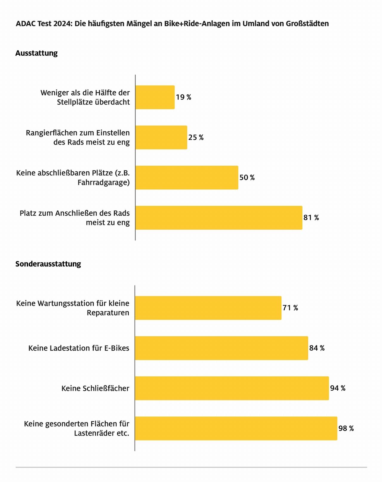Insbesondere in puncto Ausstattung und Extras gibt es aus Sicht des ADAC jedoch Luft nach oben: Rund ein Viertel der untersuchten Stellplätze war nicht überdacht. Lademöglichkeiten für E-Bikes suchten die Tester an 84 Prozent und Schließfächer sogar an 94 Prozent der Bahnhöfe vergebens. Auch abschließbare Abstellmöglichkeiten wie Fahrradgaragen oder -boxen fanden sich nur an der Hälfte der untersuchten Bahnhöfe. Und wenn es welche gab, waren sie oftmals stärker ausgelastet beziehungsweise sogar komplett ausgebucht.
