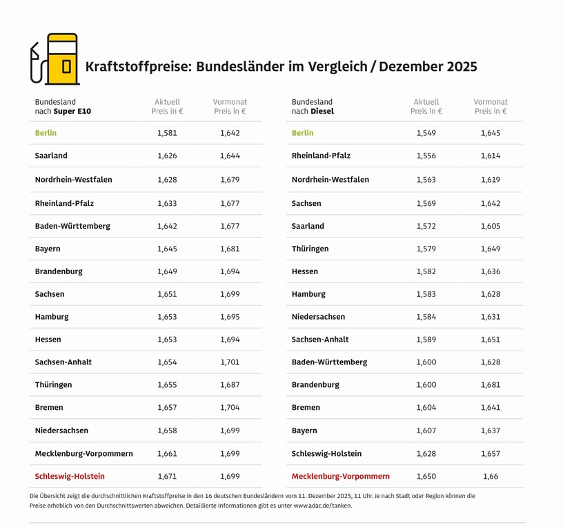 Für Super E10 müssen die Berliner Autofahrer derzeit 1,581 Euro je Liter bezahlen Im Saarland, dem zweitplatzierten Bundesland, liegt der Literpreis mit 1,626 Euro immerhin 4,5 Cent darüber. In Schleswig-Holstein werden hingegen im Mittel 1,671 Euro fällig.
