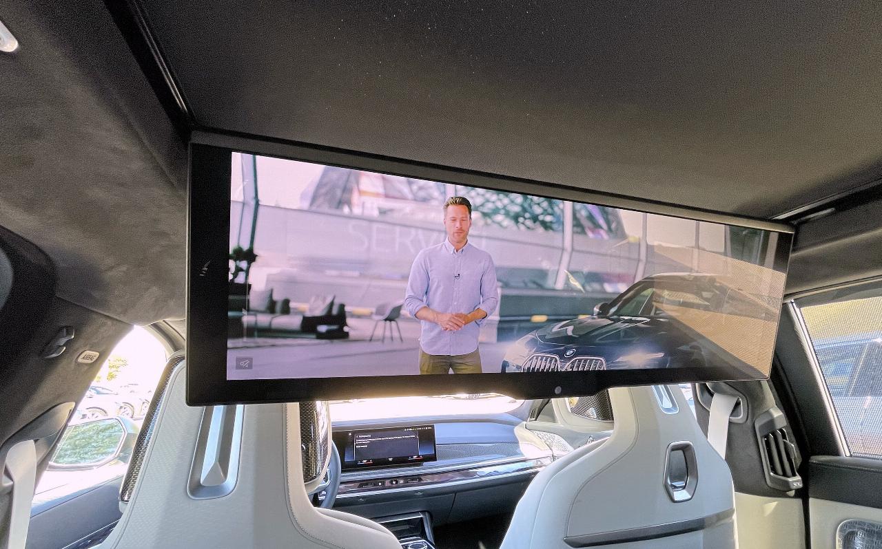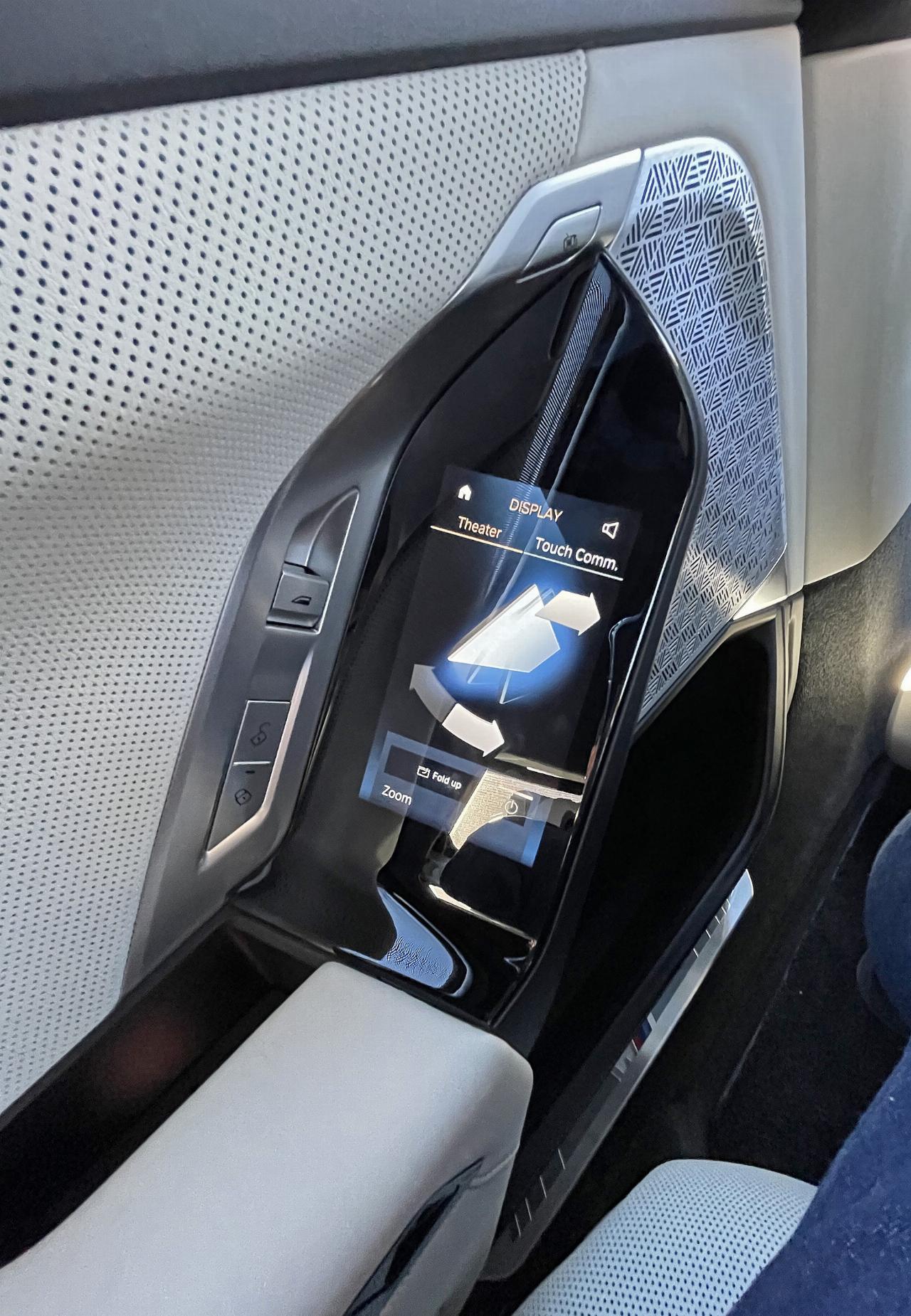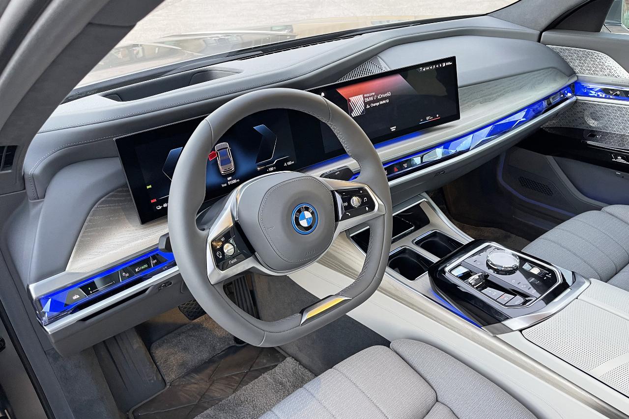Der als „Interaction Bar“ bezeichnete Lichtstreifen in Kristalloptik am Armaturenbrett und der 31 Zoll große „Theaterscreen“-Bildschirm im Fond sind die wohl auffälligsten Elemente in diesem Auto. Das alles wirkt sehr klar und aufgeräumt. Für die elektronikaffine Klientel sind, vom neuen BMW Operating System 8 unterstützt, vielfältige weitere Funktionen an den Bildschirmen zu erkunden. Angenehm finden wir, dass der Automatikschalthebel gegen einen Kippschalter ersetzt wurde, denn Ladeschale und Becherhalter sind nun ungestört zugänglich.