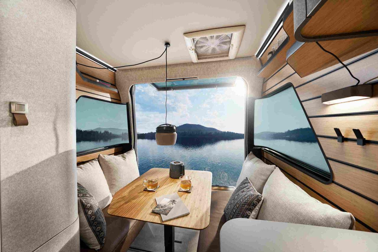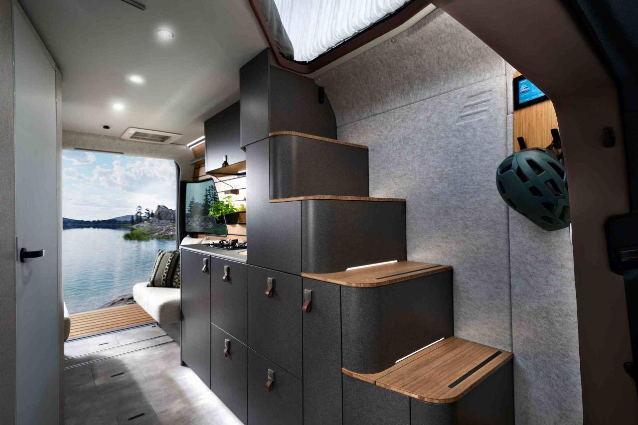 Im Heck findet sich eine Face-to-Face-Sitzgruppe mit Lounge-Charakter und einem klappbaren Tisch, der bei Bedarf zusammen mit den beiden Sitzbänken zum Bett für zwei wird. Das eigentliche Schlafzimmer findet sich jedoch in der zweiten Etage. Das Dach kann pneumatisch aufgestellt werden, die luftgefüllten Wände seitlich und vorn bilden eine Art Alkoven und sollen für ausgezeichnete Isolationswerte sorgen. Ein Doppelbett mit gut zwei Metern Länge verspricht unterdessen guten Schlafkomfort. Hinauf geht es nicht über eine Leiter sondern eine bequeme Treppe, die sich über den Küchenblock schwingt und in deren Stufen reichlich Stauraum aufs Befüllen wartet.