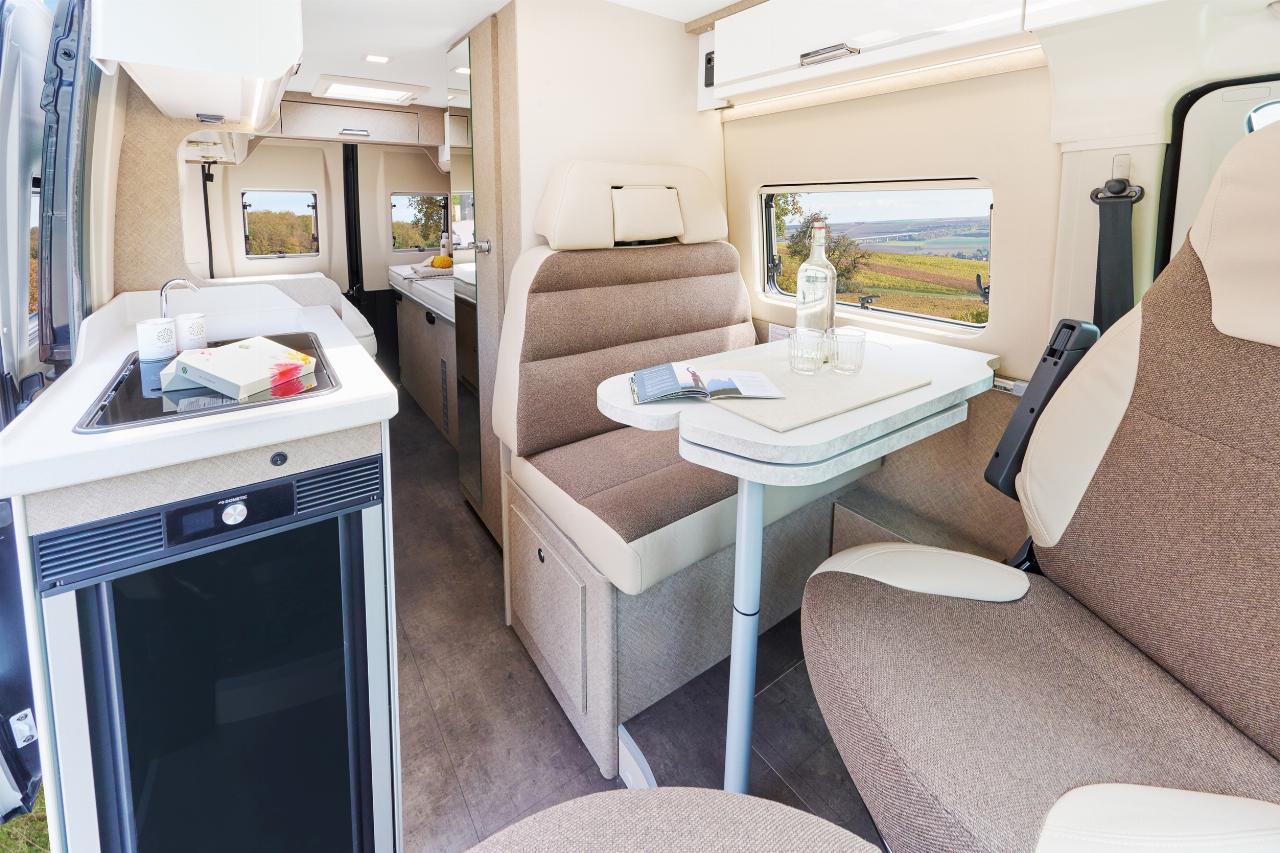 Der kompakte Küchenblock ist mit einem Zweiflammen-Gaskocher, Spüle sowie Ober- und Unterschrank ausgestattet. Der Kühlschrank mit beidseitigem Anschlag ist im Eingang positioniert, so können kühle Getränke auch von außen entnommen werden. Das Interieur wird von einer textilen Microfaser-Optik an den Möbelfronten und Schränken geprägt. Die Stoffstruktur gibt dem Camper-Van eine stilvolle Wohnlichkeit