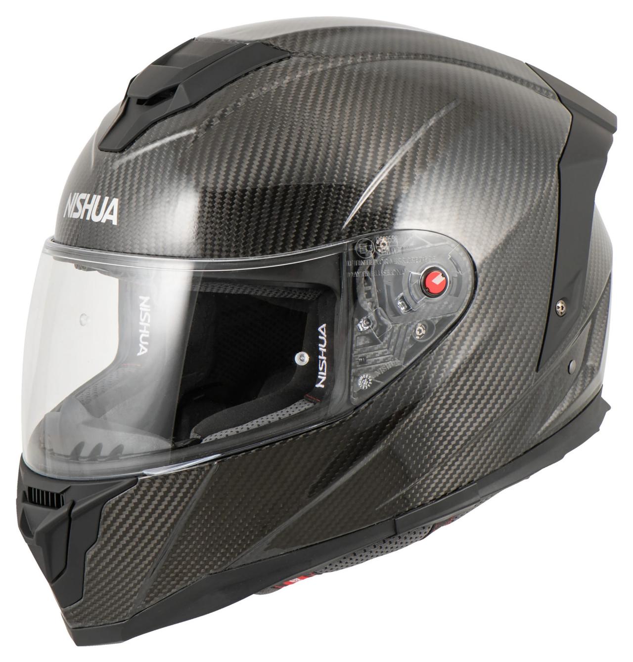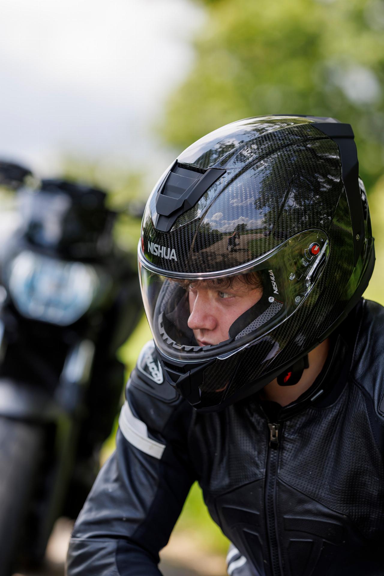 Die Abrisskante oben und der Nackendiffusor weisen ihn als Sporthelm aus. Das gilt auch für den klassischen Doppel-D-Verschluss und die Visiersperre. Der Nishua NRX-3 verfügt über ein Pinlock-Innenvisier und ein herausnehmbares sowie waschbares Innenfutter. Das Emergency-Strap-System erleichtert die Abnahme des Helms nach einem Unfall.