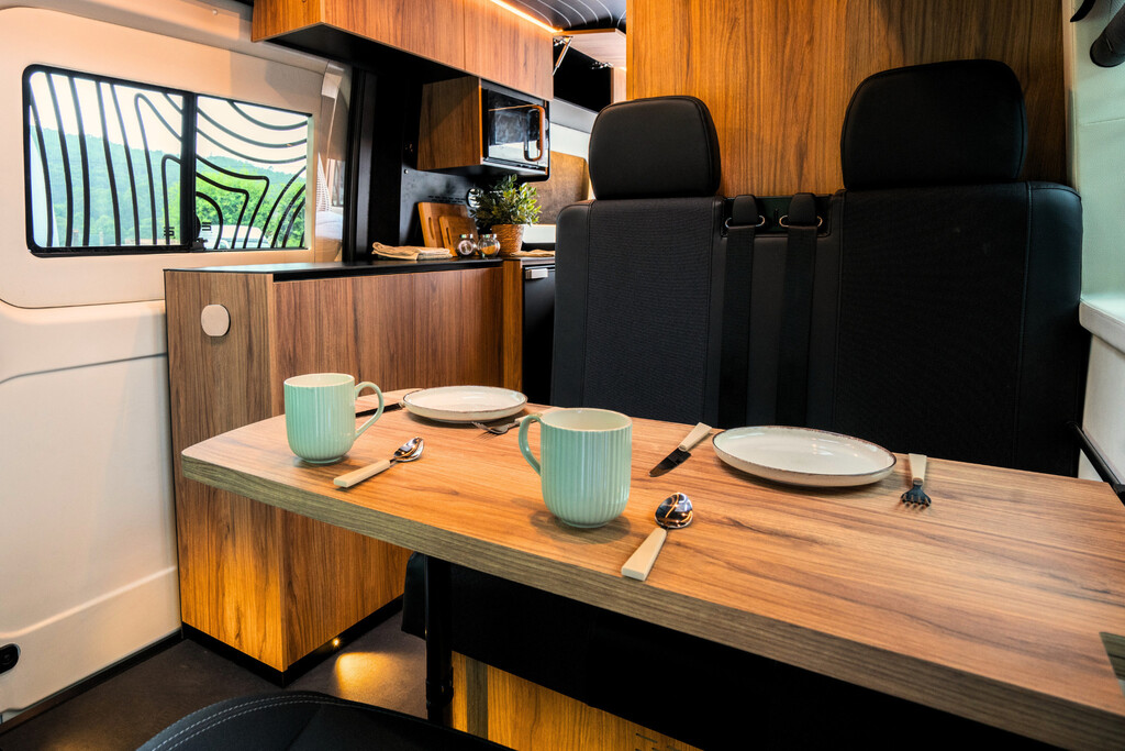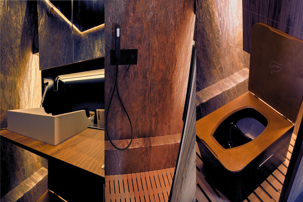 Vor allem die Vanlife-Ausstattung kann sich sehen lassen. Spezialitäten wie eine Corian Arbeitsplatte auf der Küche mit integrierter Spüle und Induktionsherd und ein 85 Liter großer Kompressor-Kühlschrank gehören zum Serienstandard. Im Waschraum wird ebenfalls der Mineralwerkstoff Corian als Material für Dusche und das Klapp-Waschbecken genutzt, der Boden ist mit wärmendem Bambusholz belegt. Besonders schick ist die Wandverkleidung aus dünnem, anthrazitfarbenem Naturstein. Ungewöhnlich ist außerdem die Ausstattung mit einer Trockentoilette von Eco Klos. Eine verstärkte Lüftung und indirekte LED-Beleuchtung komplettieren die Einrichtung des Waschraums. Manchem zu knapp könnte die Heckliegefläche sein, sie zwar zwei Meter Länge, ab er nur 120 Zentimeter in der Breite. Zehn Zentimeter größer fällt das Bett im Hubdach beim Mencia 420e aus.