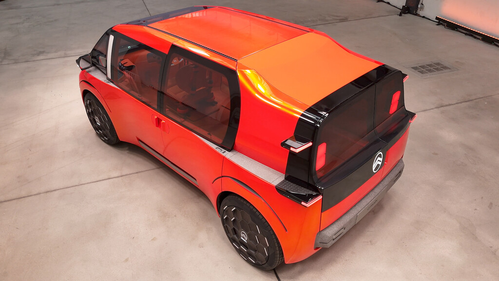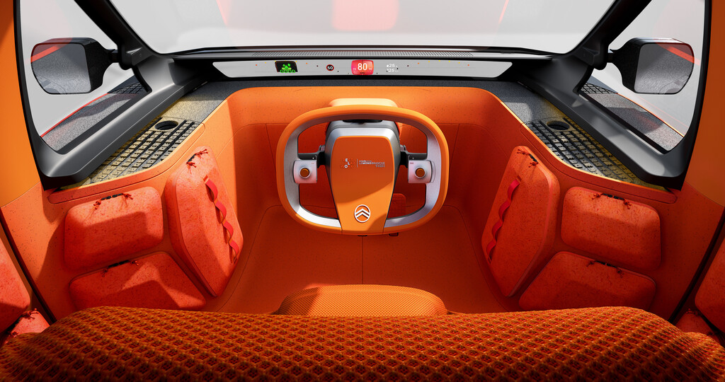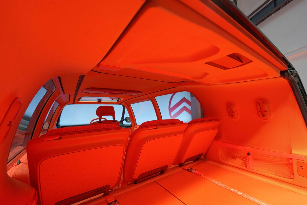 Der Elo mag klein sein, doch, so Chardon, „klein ist das neue groß“, und in der Tat erreicht die ganz in der Citroën-Tradition ausgefallen gestaltete Studie im Innenraum Werte, wie sie ansonsten höchstens im nächsthöheren Segment zu finden sind. Dabei ist natürlich der Radstand von 2,74 Metern hilfreich. Das ist ein Zentimeter mehr als beim deutlich größeren C5 Aircross. Im Fond reicht der Platz für drei Passagiere, die sich hinter dem zentral platzierten Menschen hinter dem Lenkrad einfinden. Unter der Rückbank sind zwei zusätzliche Sitze untergebracht, die sich neben dem Piloten mit wenigen Handgriffen montieren lassen. Mit dem Elo verwirklichten die Kreativen in Paris einen Innenraum, der die Vorteile der Elektromobilität nutzt.