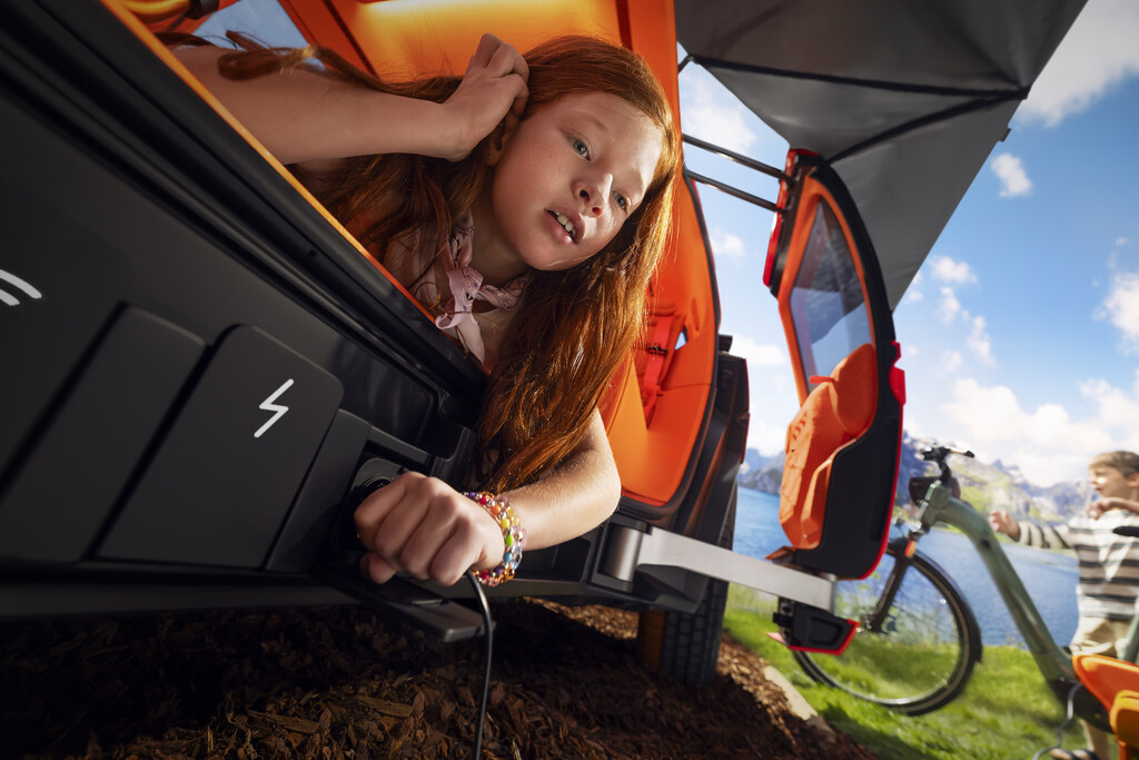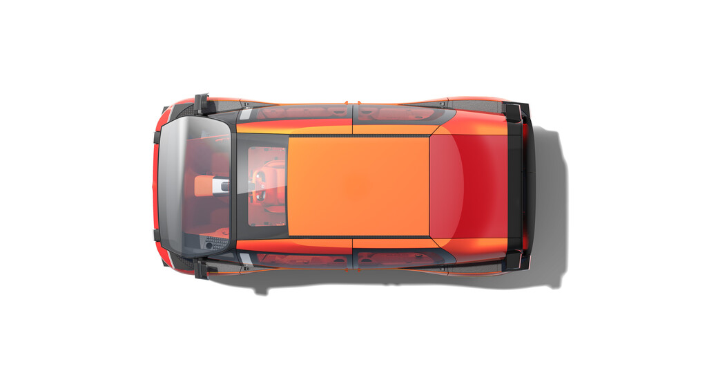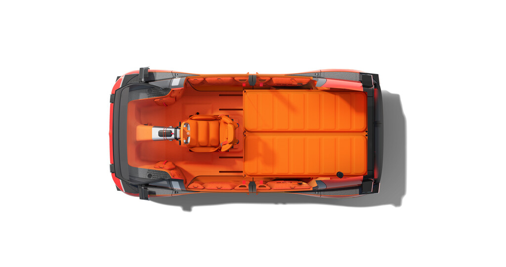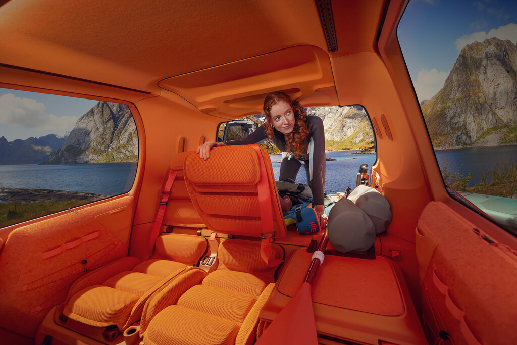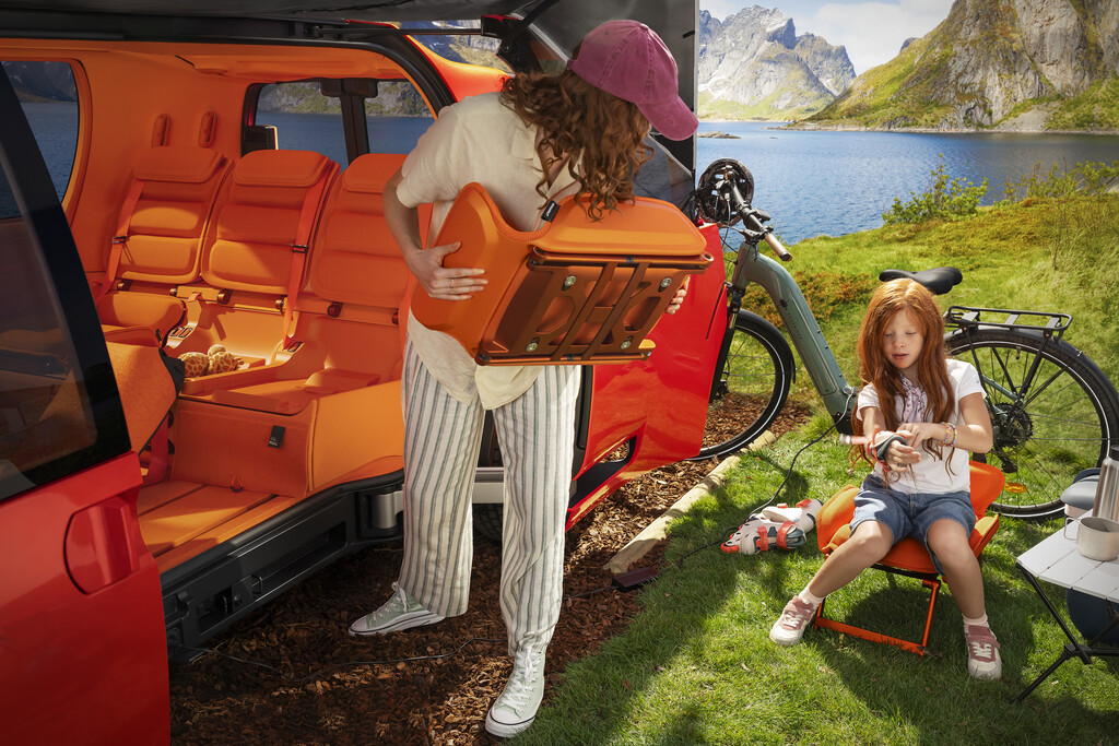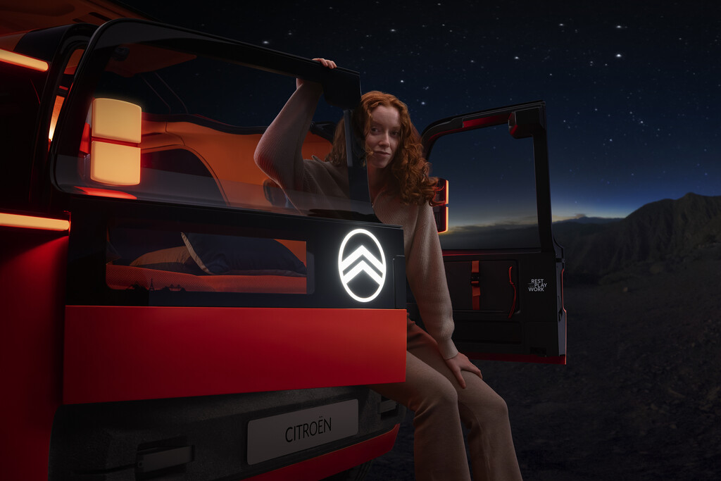 Der Elo entstand in Zusammenarbeit mit dem französischen Freizeit- und Sportspezialisten Decathlon und entsprechend deutlich ist das Element „Rest“ ausgefallen. Die Sitze im Fond lassen sich im Handumdrehen in eine Liegefläche für verwandeln, und eine Luftmatratze dient als Auflage für eine Nacht unter den Sternen, denn der Elo hat zwei Dachöffnungen, um Romantik in die gemeinsame Nacht zu bringen. Das erinnert an den 2CV, bei dem sich die Rückbank ebenfalls demontieren und gegen eine Schlafauflage austauschen ließ. Die beiden hinteren Lichtkapseln mutieren zu Nachttischlampen, und mittels von Decathlon entwickelten Halterungen lässt sich ein Overheadprojektor montieren, um auf einer ausfahrbaren Leinwand ein individuelles Unterhaltungsprogramm abzuspielen.