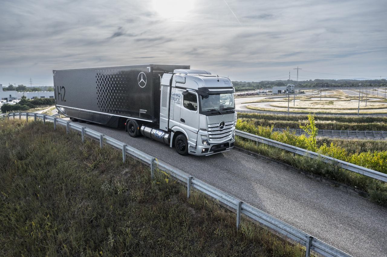 Neben dem bereits im Test befindlichen Prototyp erprobt Daimler Truck nun eine weitere Version des Brennstoffzellen-Lkw Mercedes-Benz GenH2 Truck. Er fährt Flüssigwasserstoff. Während des Betankungsvorgangs wird minus 253 Grad Celsius tiefkalter Flüssigwasserstoff in zwei jeweils seitlich am Fahrgestell montierte 40-Kilo-Tanks gefüllt. Durch die besonders gute Isolierung der Fahrzeugtanks kann der Wasserstoff für eine ausreichend lange Zeit ohne aktive Kühlung auf Temperatur gehalten werden.