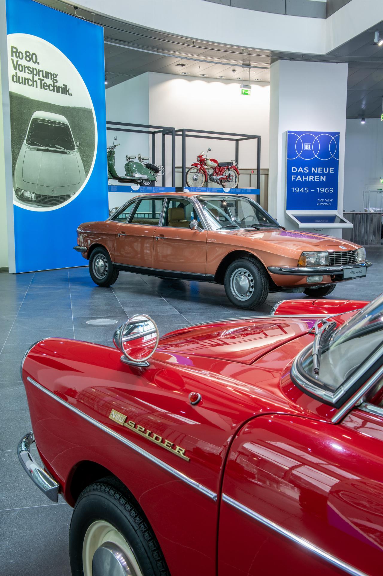 In der Sonderschau nicht fehlen darf der NSU Wankel Spider, das erste Automobil mit serienmäßigem Kreiskolbenmotor. Das zweisitzige Cabrio, gezeichnet von der italienischen Designerlegende Giuseppe Bertone, war eine Sensation auf der IAA 1963. Mit dem weiteren Wankelmodell Ro 80 und seiner wegweisenden Form schrieb die Marke in den 1970er-Jahren ebenfalls noch einmal Automobilgeschichte. Das Exponat eines Volkswagen K 70 steht für das letzte bei NSU entwickelte Fahrzeug. Berühmt-berüchtigt waren auch die kleinen Heckmotor-Flitzer NSU TT und TTS, die auf der Rennstrecke für Furore sorgten.