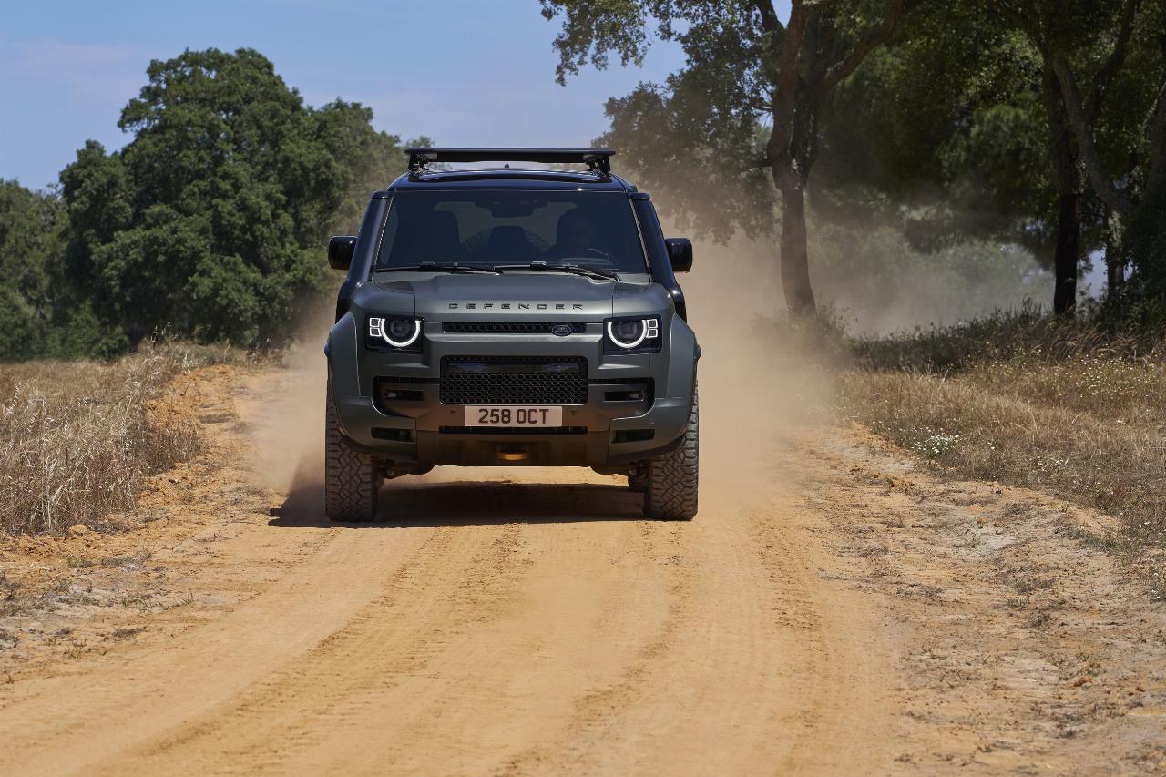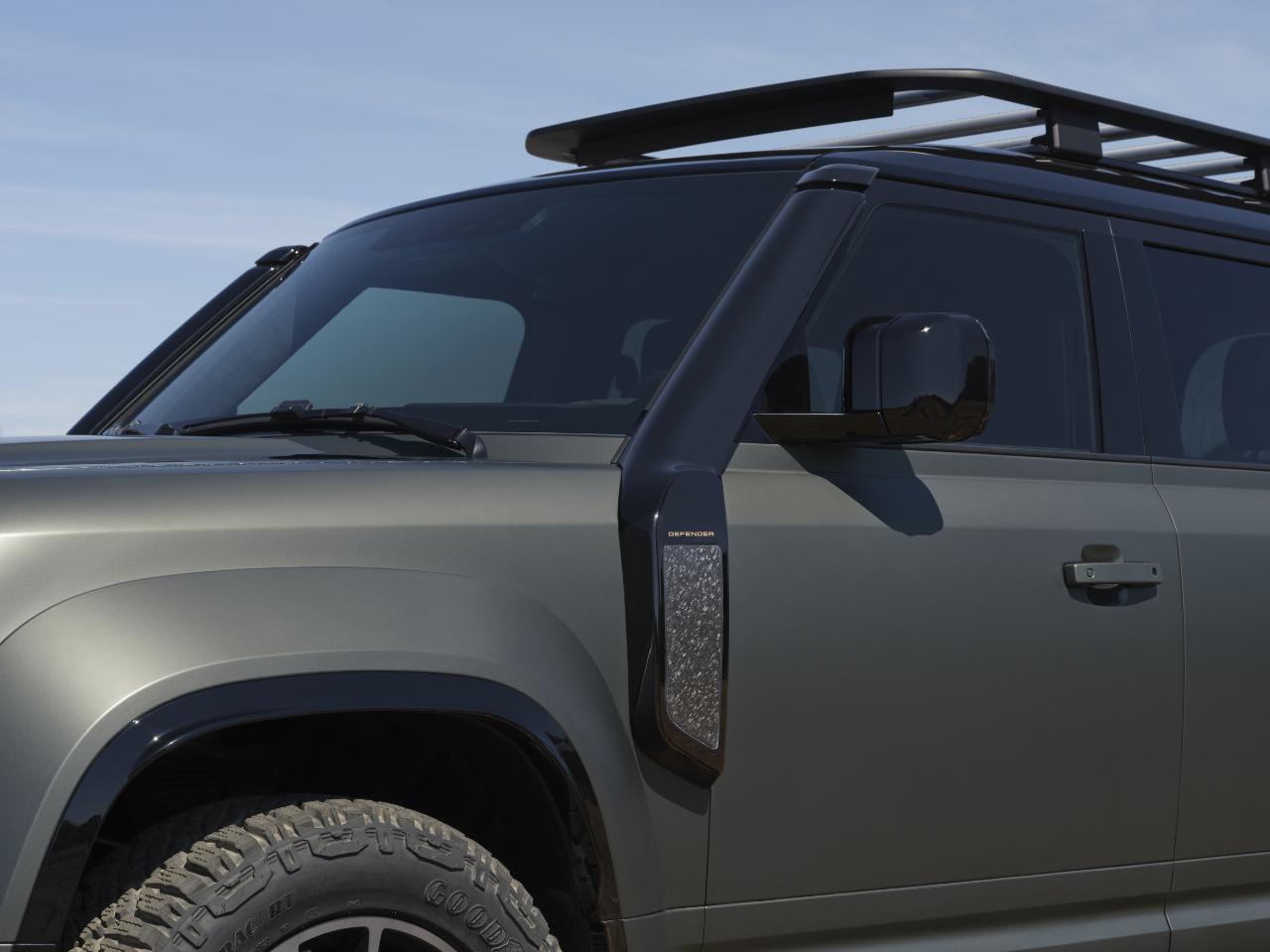 Der Defender Octa ist knapp drei Zentimeter höher und mit seinen ausgestellten Radkästen gut sieben Zentimeter breiter als die übrigen Serienversionen. Er verfügt über eine Wattiefe von einem Meter. Das Fahrzeug erkennt automatisch, auf welchem Untergrund er aktuell unterwegs ist und optimiert seine Fahrprogramme und Dynamikeinstellungen entsprechend.