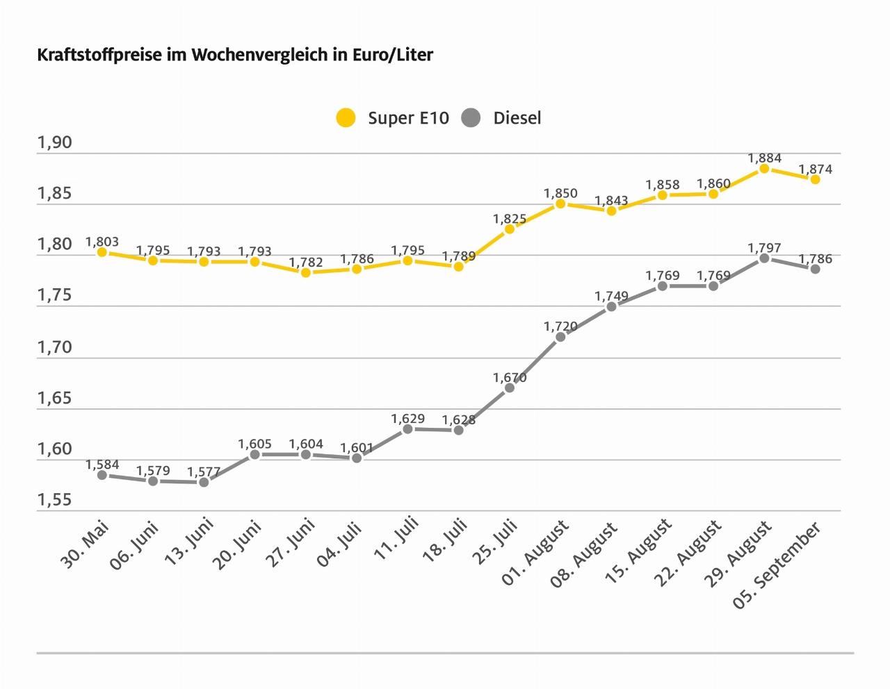 Mit der aktuellen Entwicklung verringert sich erneut die Preisdifferenz zwischen beiden Kraftstoffsorten. So ist Diesel derzeit nur noch 5,1 Cent günstiger als Super E10, obwohl die Energiesteuer für Diesel rund 20 Cent niedriger liegt. Noch vor zwei Monaten betrug der Unterschied 16,6 Cent je Liter. (aum)