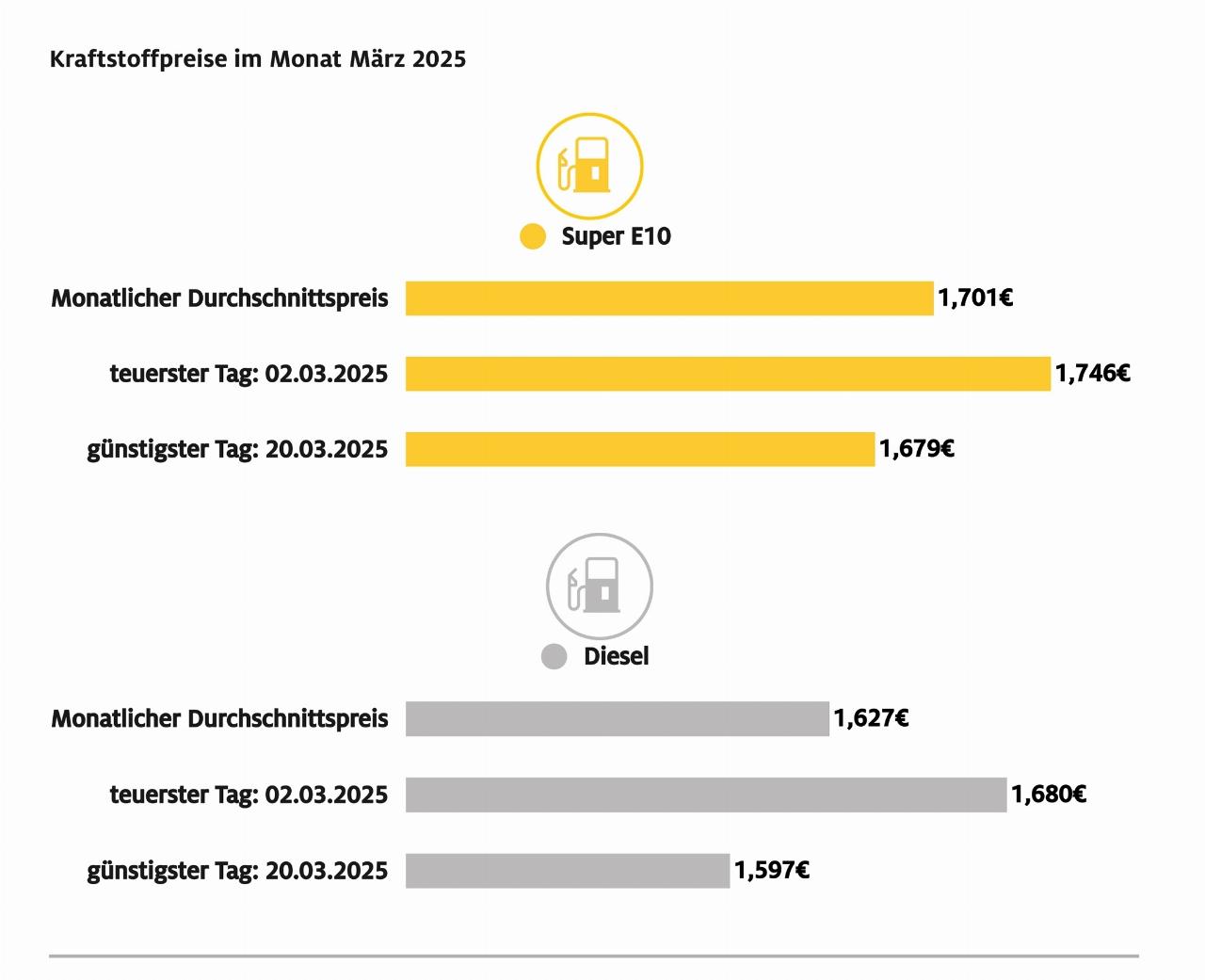 Günstigster Tag zum Tanken war im vergangenen Monat und damit im bisherigen Jahresverlauf für beide Kraftstoffsorten der 20. März. Ein Liter Super E10 kostete im Tagesmittel 1,679 Euro, ein Liter Diesel 1,597 Euro. Am teuersten war der Liter am 2. März mit 1,746 Euro für Benzin und 1,680 Euro für Diesel. (aum)