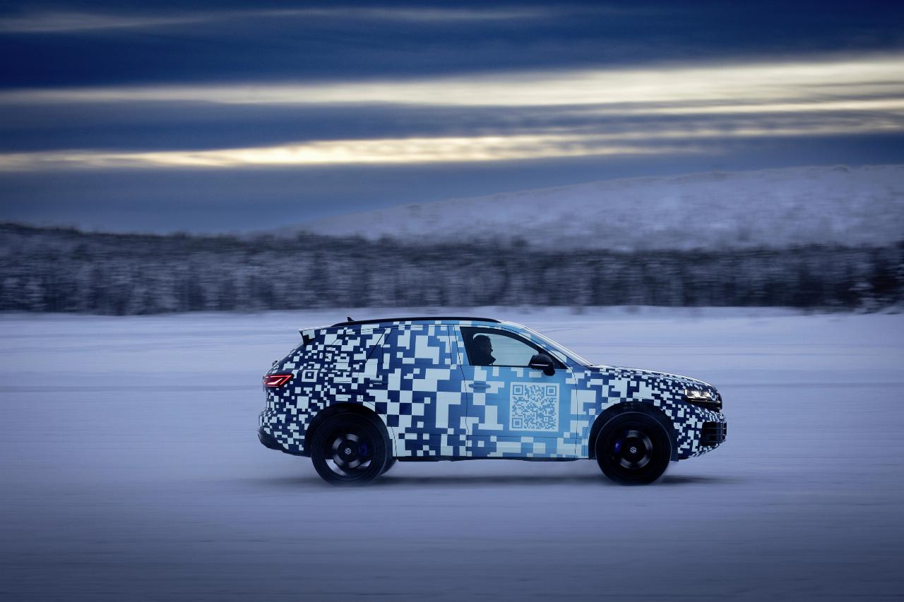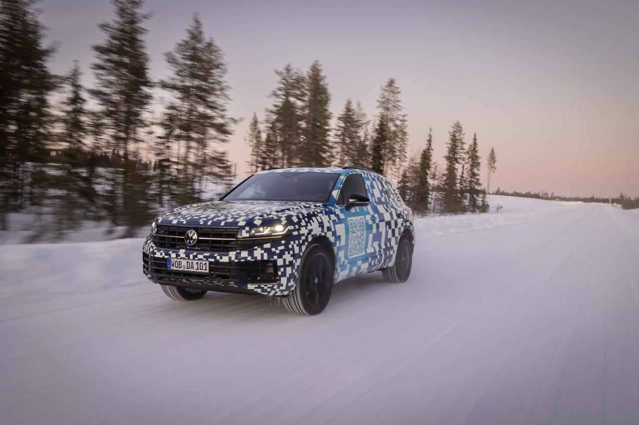 Die Erprobungsfahrzeuge sind noch durch Pixel eines überdimensionalen QR-Codes getarnt. Wer ihn mit dem Smartphone scannt, gelangt auf die Online-Seite Volkswagen-Touareg, die weitere Informationen zur Modellpflege liefert.