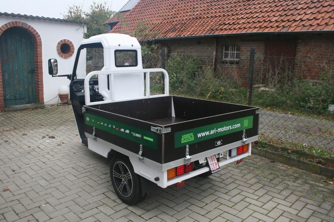 Unterhalb des 458 rangiert bei Ari das 45 km/h schnelle Lastenmoped 345, eine Art türlose Vespa Ape. Das Original kommt vom chinesischen Hersteller Ainag und wird in Borna mit insgesamt zehn verschiedenen Aufbauoptionen von der Pritsche bis zum rollenden Verkaufsstand in verschiedenen Größen angeboten. Per einfachem Kippschalter werden Leerlauf, Vorwärts- und Rückwärtsfahrt eingelegt. Die blattgefederte Hinterachse wird von einem 3-kW-Elektromotor (4,1 PS) angetrieben und kann bis zu 325 Kilogramm Ladung stemmen.