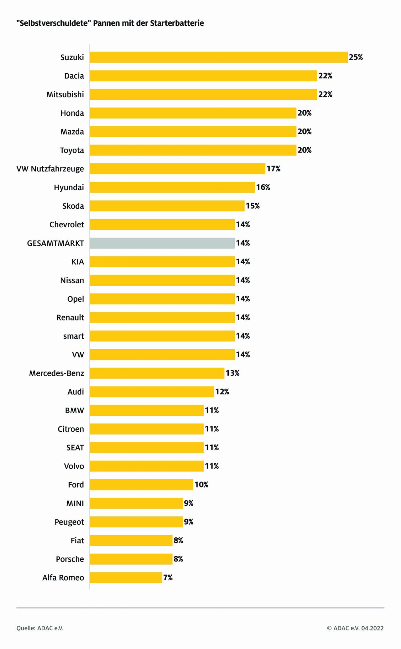 Die Gründe für ein Batterieversagen können vielfältig sein. Mal wird das Licht angelassen oder der Kofferraumdeckel nicht richtig geschlossen, insbesondere belasten aber dauerhaft kurze Strecken die Batteriekapazität, da die Lichtmaschine nicht ausreichend nachlädt. Zwar versuchen laut ADAC die Hersteller, das Bordnetz ausreichend gegen fehlerhafte Bedienung und ungewollte Kapazitäsverluste abzusichern, aber es gibt deutliche Unterschiede. So haben die Pannenhelfer des Automobilclubs festgestellt, dass beispielsweise bei Pannen mit einem Suzuki bei jedem vierten Batterieproblem (25 Prozent) der Fahrer die Schuld hatte. Bei Alfa Romeo hingegen lag der Anteil mit nur sieben Prozent am niedrigsten.