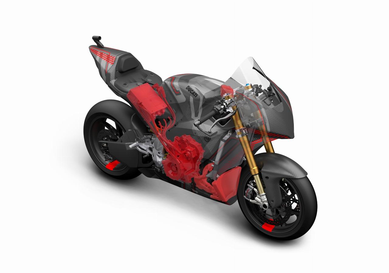 Das Batteriepaket mit Carbongehäuse macht nahezu die Hälfte des Gewichts aus und hat eine Kapazität von 18 kWh. Die Ladesteckdose (20 kW) für das 800-Volt-System ist im Heck integriert. Der Ladevorgang auf 80 Prozent der Batteriekapazität dauert etwa 45 Minuten. Der Elektromotor mit einer Höchstdrehzal von 18.000 Umdrehungen in der Minute wurde von einem Zulieferer nach den Vorgaben von Ducati entwickelt.