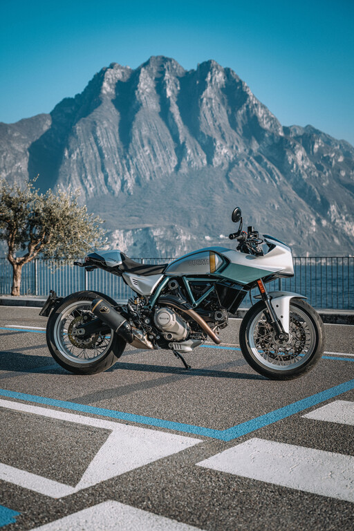 Die silber- und aquagrüne Lackierung im Stil der originalen 750 Super Sport ist das Ergebnis sorgfältiger Recherchen im Firmenarchiv. Der vertikale goldene Streifen auf dem Tank greift den unbehandelten Streifen der 750 Imola Desmo auf, der es dem Team ermöglichte, den Kraftstoffstand zu kontrollieren, ohne das Motorrad zusätzliche Instrumente nötig waren. Lenkerstummel mit Lenkerendenspiegeln, die kurze, schmal zulaufende Verkleidung und das Heck unterstreichen den Café-Racer-Stil des exklusiven Sonder- und Sammlermodells. Zahlreiche Komponenten sind aus gefrästem Aluminium gefertigt – darunter Brems- und Kupplungshebel, Ausgleichsbehälter, Fußrasten sowie der serienmäßige Rizoma-Tankdeckel. Wie alle Sondermodelle von Ducati trägt auch die Formula 73 Modellbezeichnung und Seriennummer auf der Gabelbrücke. Jedes Exemplar wird mit einem Echtheitszertifikat sowie einer Sammlung historischer Bilder und Skizzen in einer speziellen Box geliefert. Zudem hält Ducati einen gemeinsam mit Arai entwickelten Helm sowie eine Sportjacke bereit, die die Lackierung der Formula 73 aufgreifen.