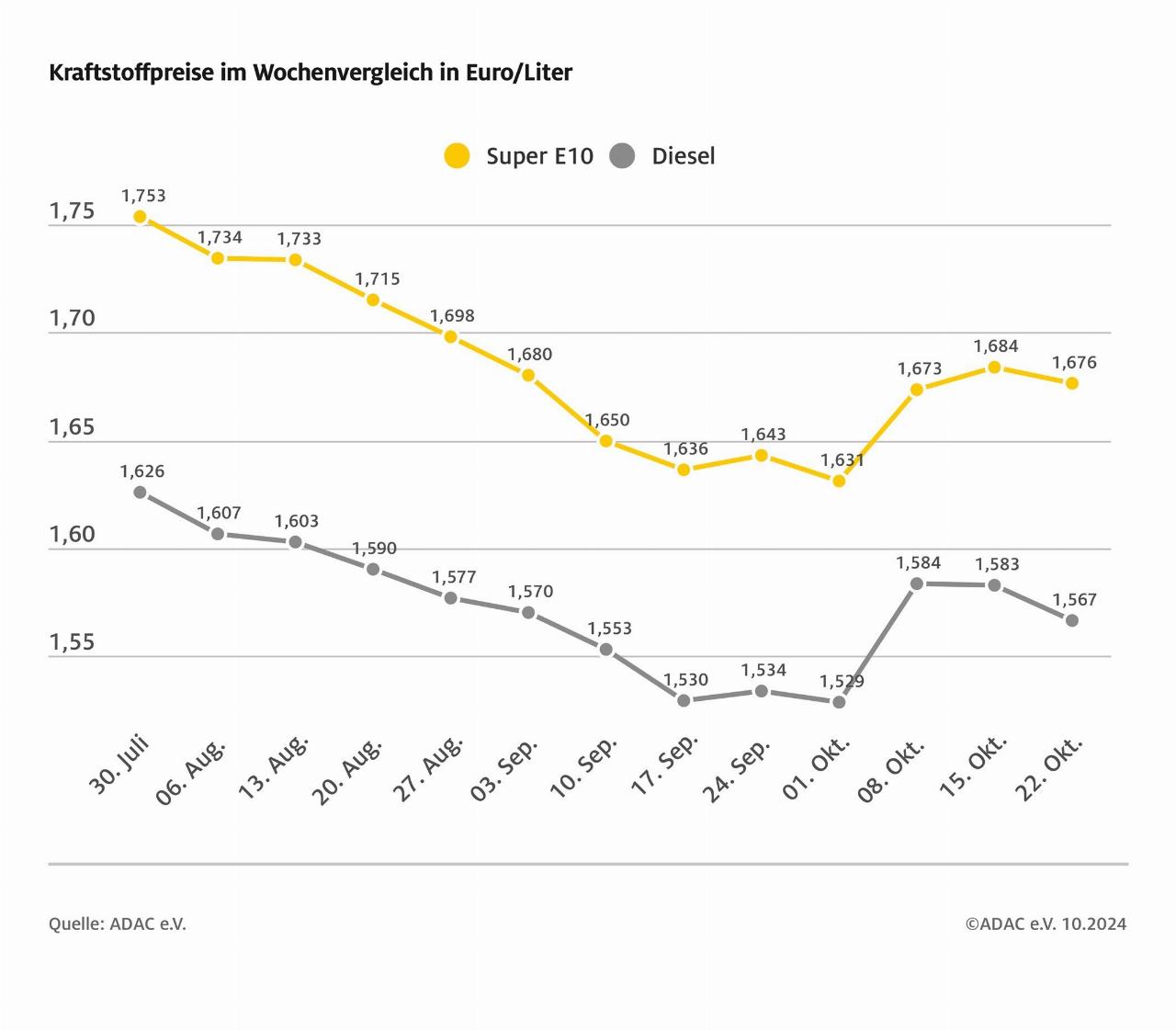 Der Preis für einen Liter Super E10 lag sank 0,8 Cent pro Liter bei 1,676 Euro. Für Diesel mussten mit 1,567 Euro insgesamt 1,6 Cent weniger pro Liter investiert werden als in den sieben Tagen zuvor. (aum)