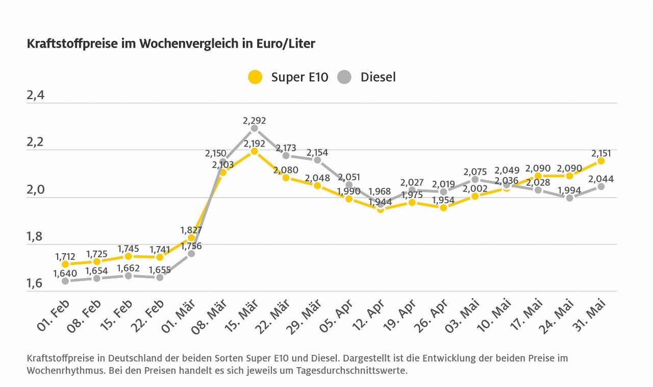 Im Monatsmittel kostete ein Liter Super E10 im Mai 2,064 Euro und damit nur einen halben Cent weniger als im bisherigen Rekordmonat März (2,069 Euro/Liter). Diesel kostete im vergangenen Monat im Schnitt 2,033 Euro und damit um 10,7 Cent weniger als im bislang teuersten Monat März (2,140 Euro/Liter). Benzin wurde zum Monatsende sukzessive teurer und lag am 31. Mai mit 2,151 Euro je Liter Super E10 auf dem Monatshöchststand. Diesel war mit einem Tagesmittel von 2,085 Euro je Liter am 5. Mai am teuersten.