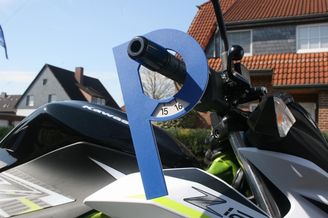 Die Start-up-Unternehmerin erfüllt mit ihrem Produkt auch die weiteren regulativen Anforderungen an eine Parkscheibe: Sie muss mindestens elf Zentimeter breit und 15 Zentimeter hoch sein. Am besten lässt sie sich einfach an einen der beiden Lenkergriffe hängen. Bleibt nur individuell die Frage zu klären, wo das Plastik-P während der Fahrt verstaut wird. Rollerfahrer dürften wegen des Staufachs unter der Sitzbank damit aber kaum Probleme haben. Und Motorradfahrer finden sicher im Seitkoffer, Rucksack, Topcase oder Tankrucksack eine Mitnahmemöglichkeit.