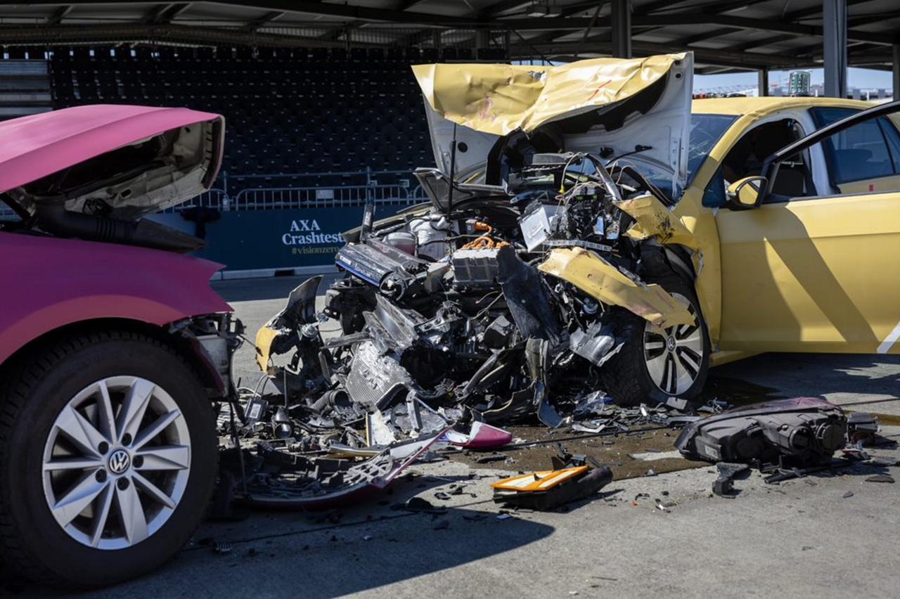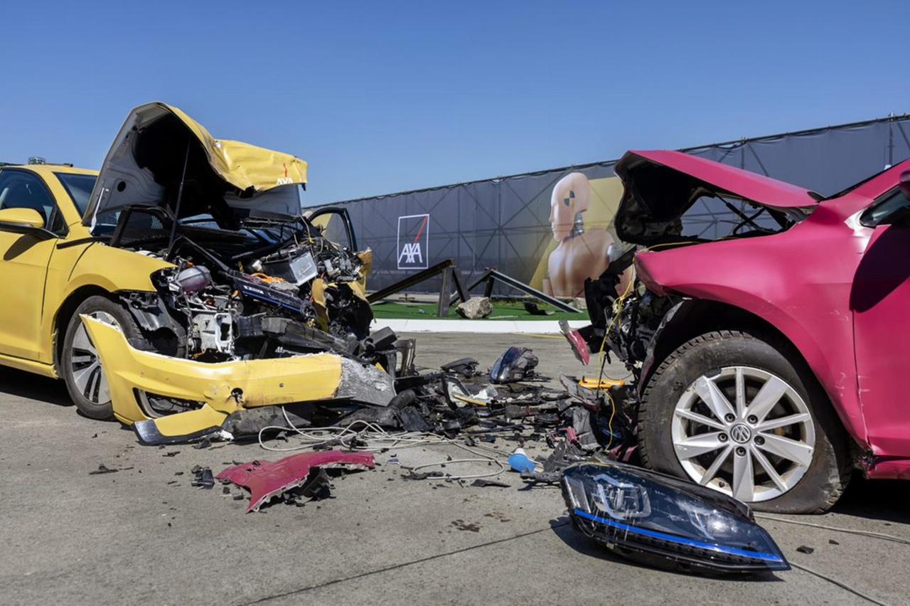Mit dem Gewicht beziehungsweise dem Gewichtsunterschied zwischen Fahrzeugen befasste sich der zweite Crash. Ein Golf VII mit Verbrennungsmotor und ein typengleiches Modell mit Elektroantrieb prallten mit einer Geschwindigkeit von 50 km/h frontal aufeinander. Der Elektro-Golf hat zwar exakt dieselben Abmessungen, ist aber wegen seiner Batterie und der höheren Steifigkeit 400 Kilogramm schwerer. Der 1250 Kilogramm wiegende Verbrenner-Golf ist bei diesem Crash einer deutlich höheren Belastung ausgesetzt und erleidet folglich einen sichtbar größeren Blechschaden als sein elektrisches Pendant. Dafür sorgt ein Grundgesetz der Physik: Die Wucht des Einschlags – der Impuls – ergibt sich aus der Multiplikation von Gewicht und Geschwindigkeit. Die Aufprallenergie des E-Autos ist also rund ein Drittel größer.