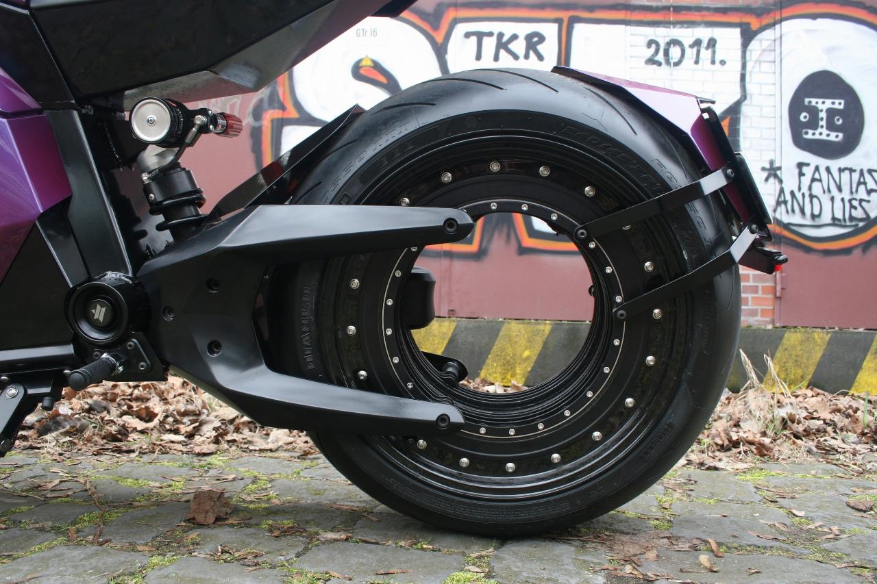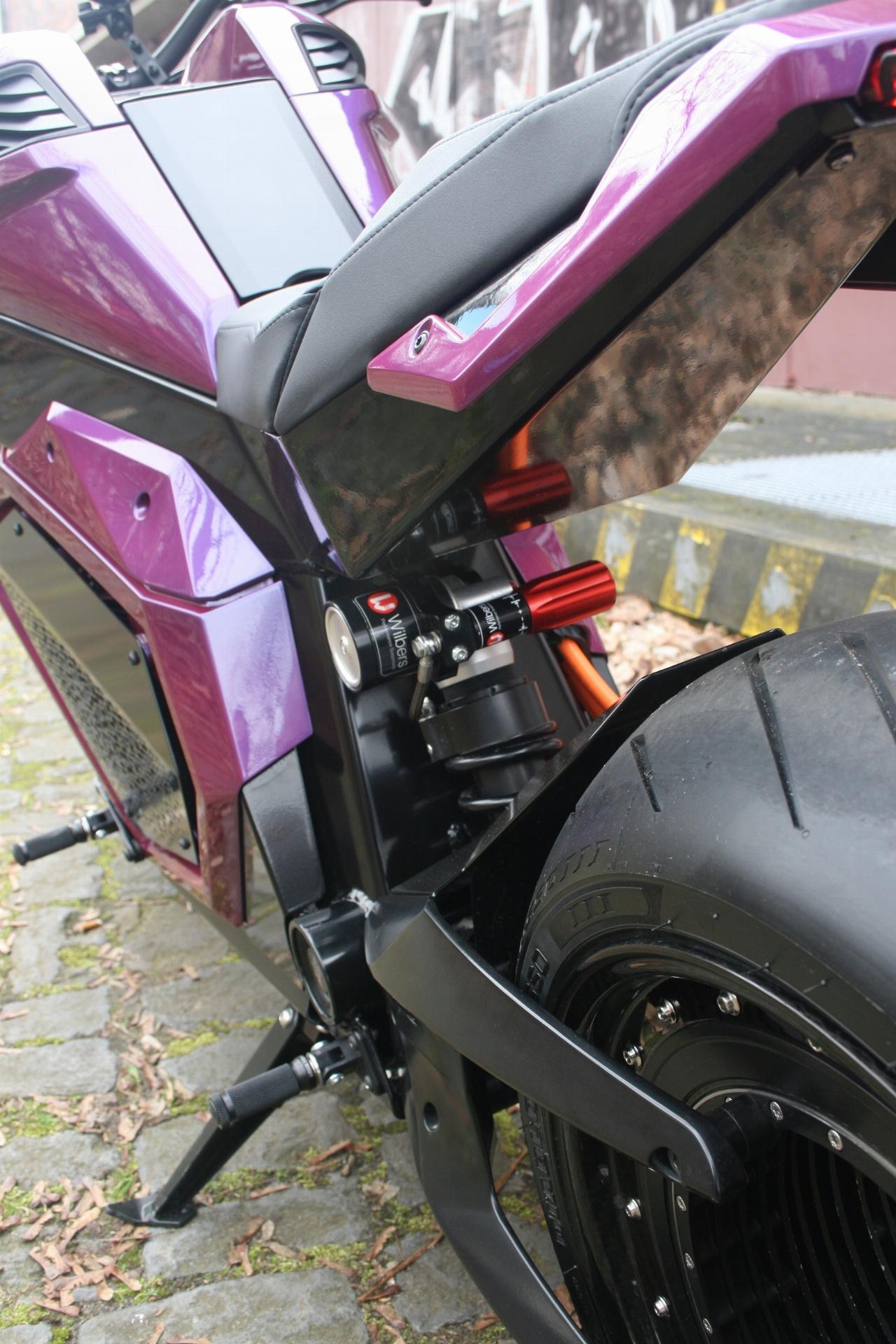 Heraus sticht auf jeden Fall der Antrieb. Die Verge hat einen Felgenmotor, der rechtsseitig montiert ist und mit drei Kabeln an die Batterie und die Steuerungselektronik angeschlossen ist. Das Rad dreht sich um die feststehende Carbon-Felge, die mit vier Streben am Rahmen befestigt ist. Zweite ungewöhnliche Lösung. Der Fahrer hat zwei Paar Fußrasten: Die vorderen für entspanntes Cruisen und die hinten fürs sportive Fahren. Letztere dienen gleichzeitig auch als Soziusrasten bei der Fahrt zu zweit.