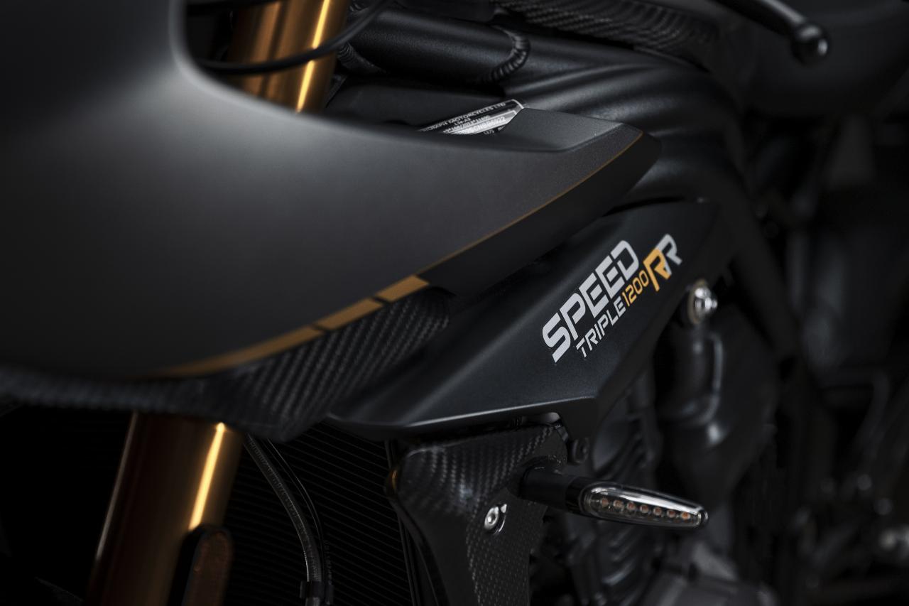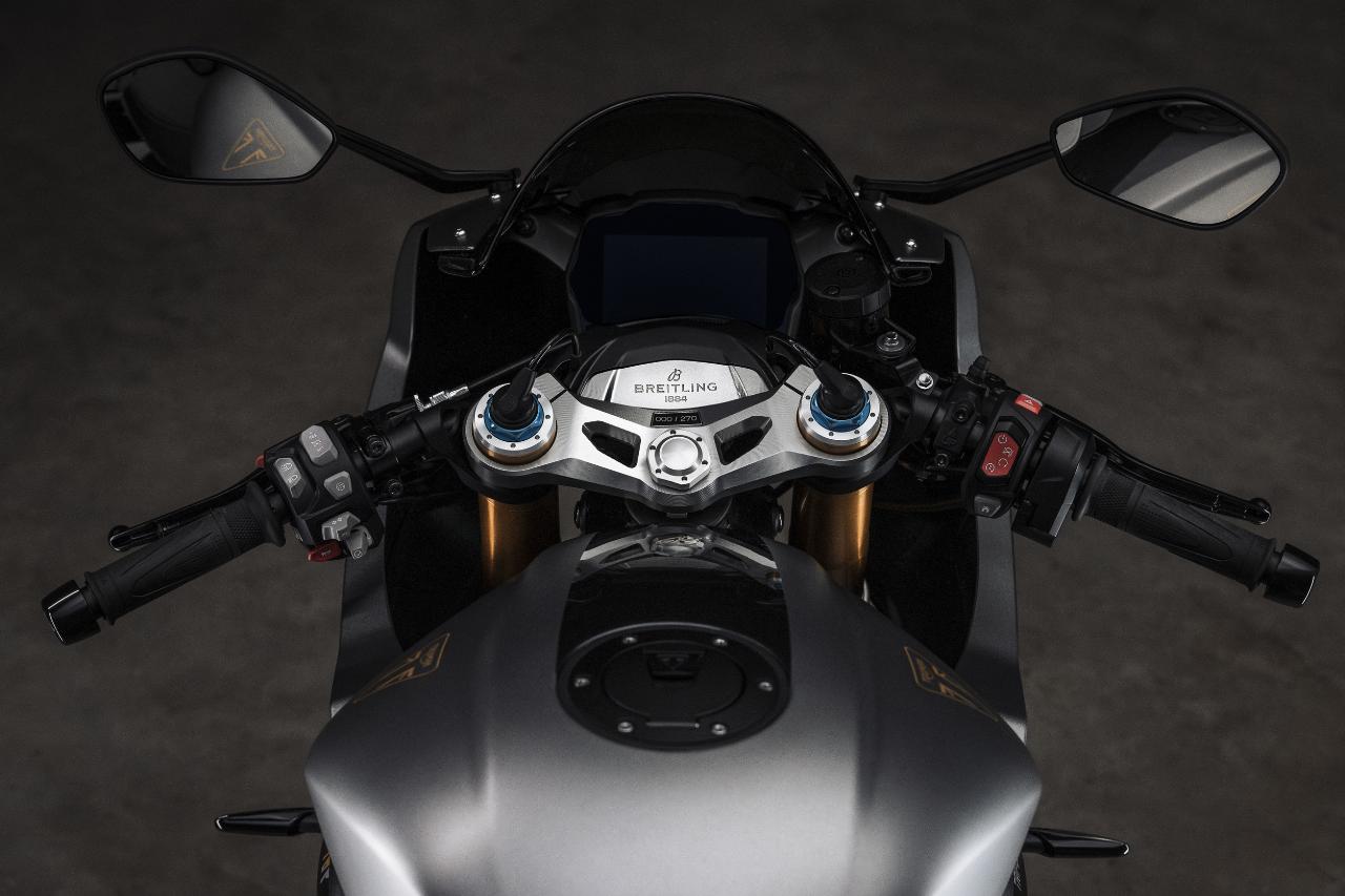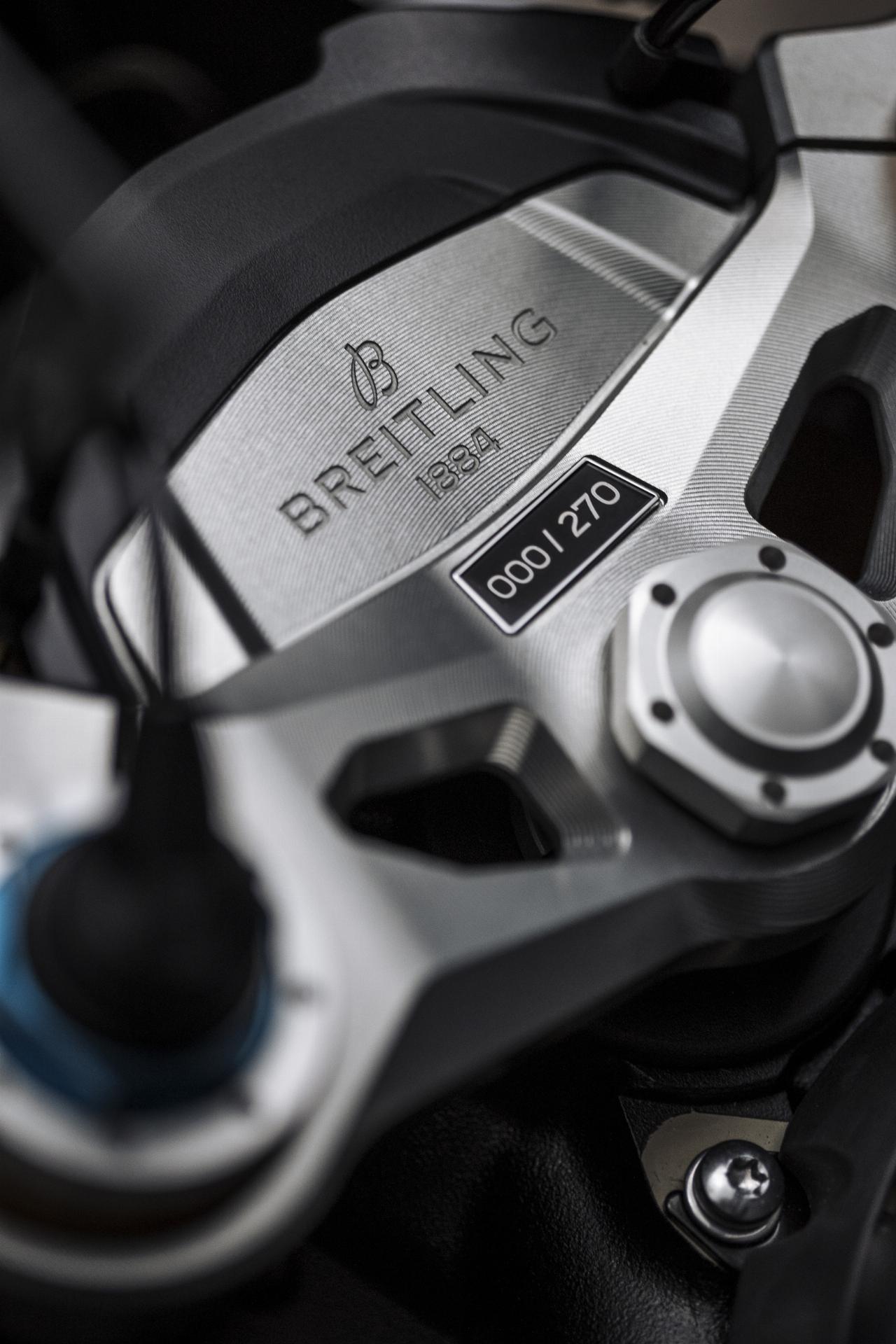 Die Speed Triple Breitling LE trägt eine spezielle Zweifarb-Lackierung mit handgemalten Premium-Golddetails, einen Ledersitz mit „französisch“ ausgeführten Nähten, einen exklusiven Auspuffendtopf von Akrapovic sowie zahlreiche Kohlefaserteile. Partner Breitling ist in einer Reihe von Details auf dem Motorrad präsent: im speziell programmierten Startbildschirm, mit einem gelaserten Logo auf der gefrästen Abdeckung der Hinterradnabe und einer goldenen Plakette auf dem Tank. Jedes Modell trägt seine Seriennummer auf der Gabelbrücke.