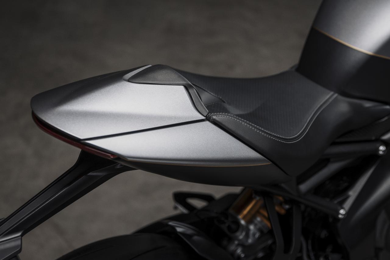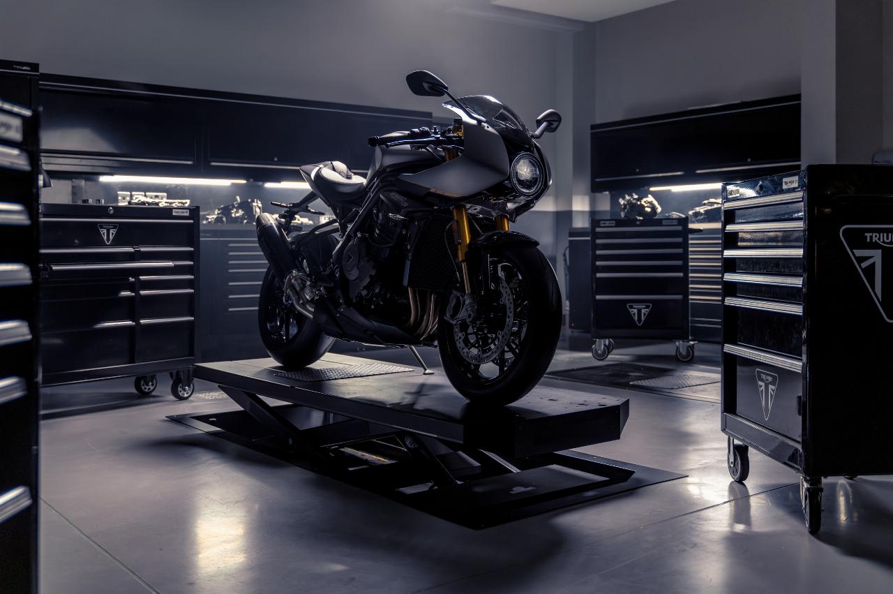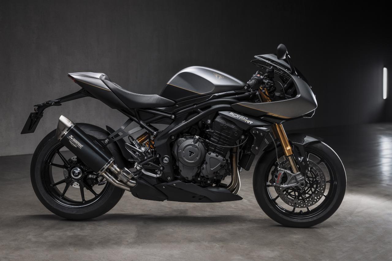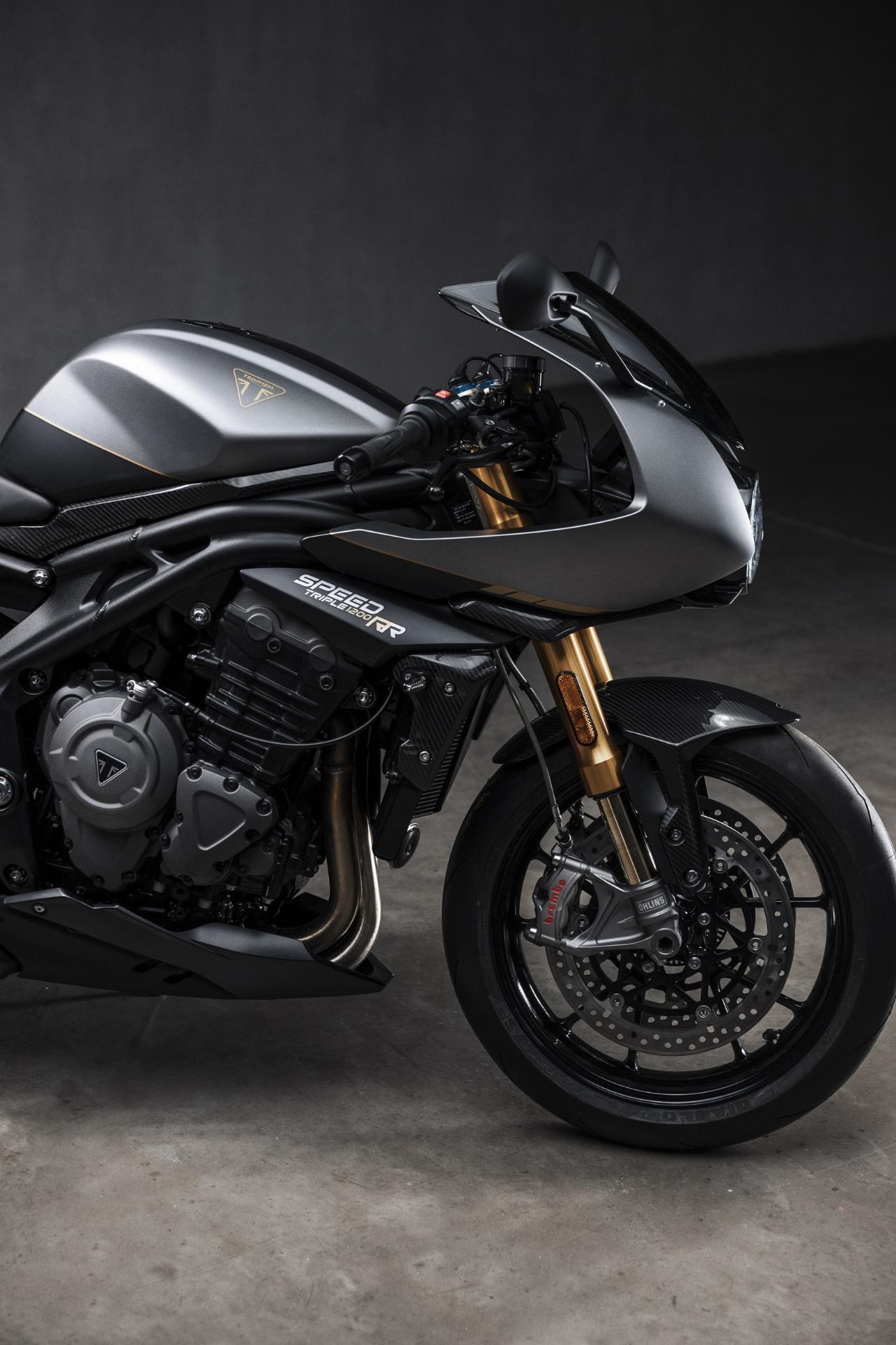 Die Speed Triple Breitling LE trägt eine spezielle Zweifarb-Lackierung mit handgemalten Premium-Golddetails, einen Ledersitz mit „französisch“ ausgeführten Nähten, einen exklusiven Auspuffendtopf von Akrapovic sowie zahlreiche Kohlefaserteile. Partner Breitling ist in einer Reihe von Details auf dem Motorrad präsent: im speziell programmierten Startbildschirm, mit einem gelaserten Logo auf der gefrästen Abdeckung der Hinterradnabe und einer goldenen Plakette auf dem Tank. Jedes Modell trägt seine Seriennummer auf der Gabelbrücke.